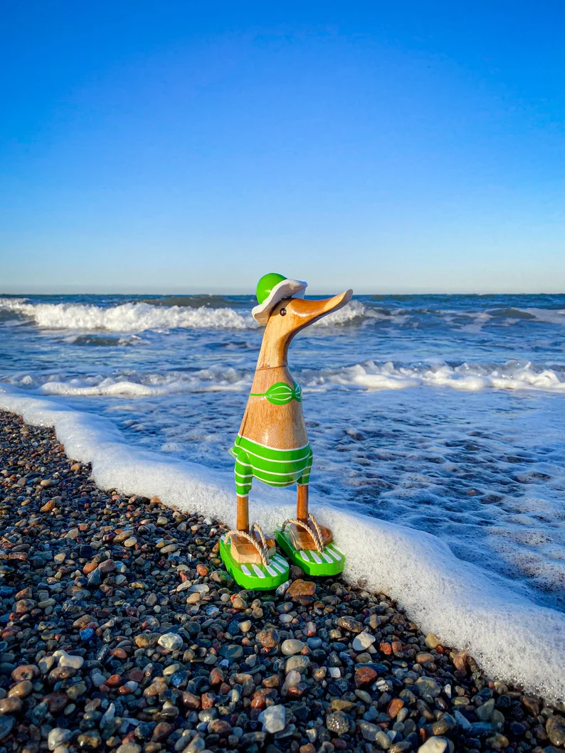 Anatra Legno Costume Verde Femmina , bellissime statue a forma di anatra, con bikini verde a righe bianche. Statue artigianali fatte interamente a mano in legno massello.