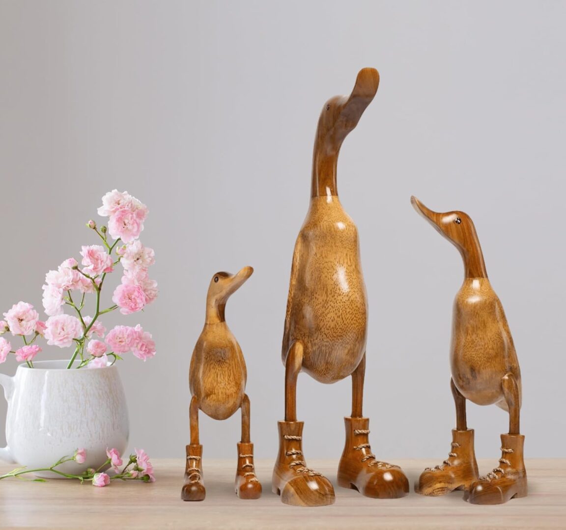 Anatra Legno, bellissime statue a forma di anatra, con scarpe. Statue artigianali fatte interamente a mano in legno massello.