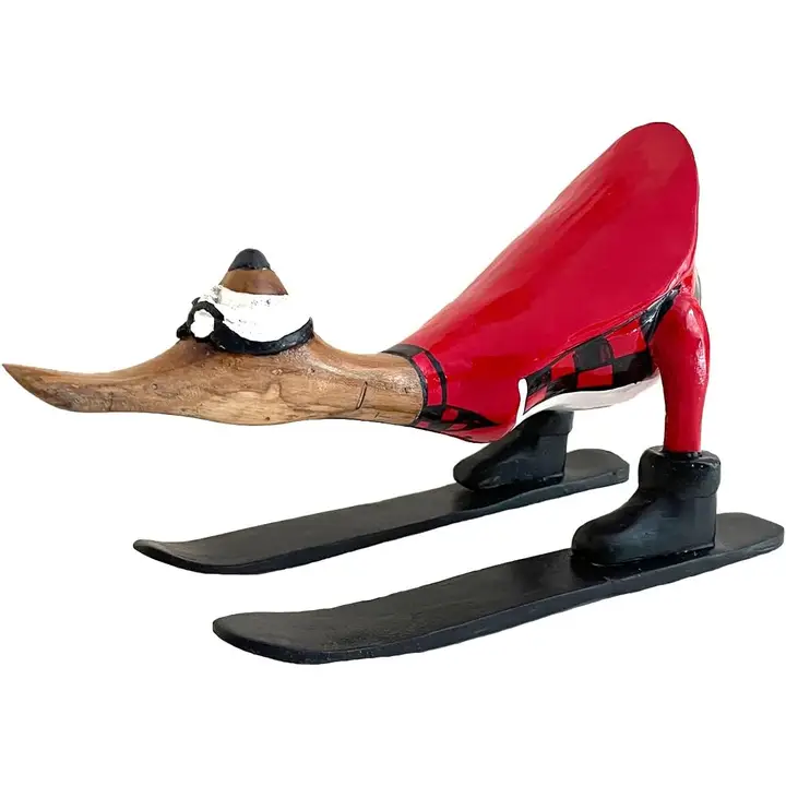 Anatra Sciatrice Rossa, bellissime statue a forma di anatra, con scii. Statue artigianali fatte interamente a mano in legno massello.