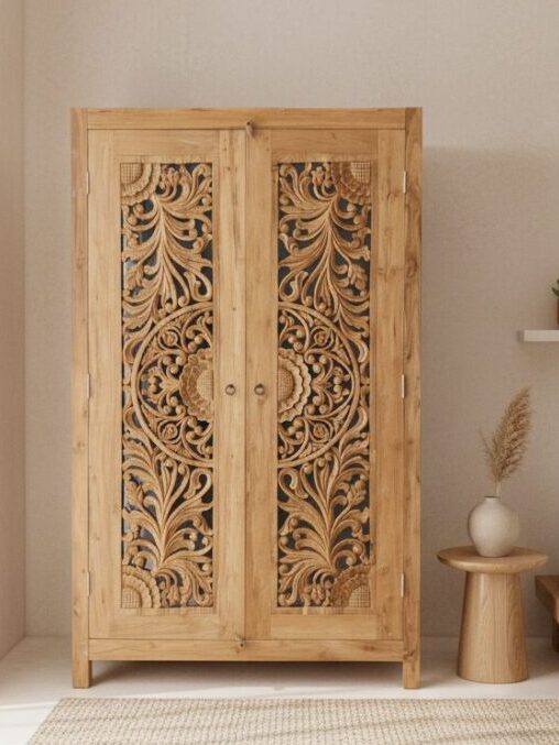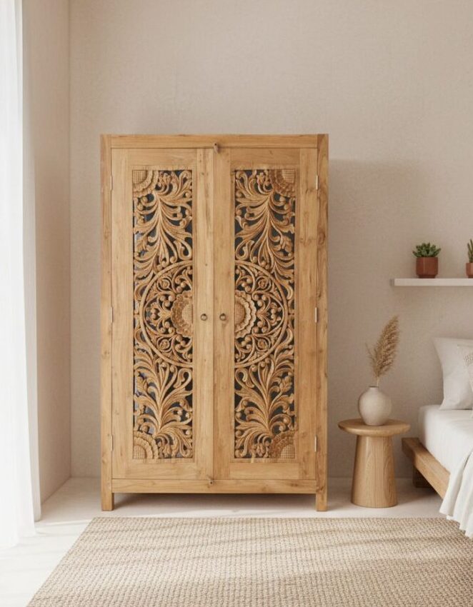 Armadio Intagliato Teak rappresenta un’opera d’arte d’arredamento di inestimabile valore, dove la storia del legno recuperato incontra la maestria assoluta dell’intaglio manuale.