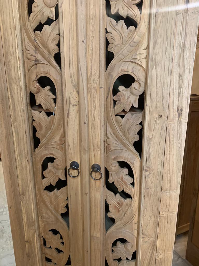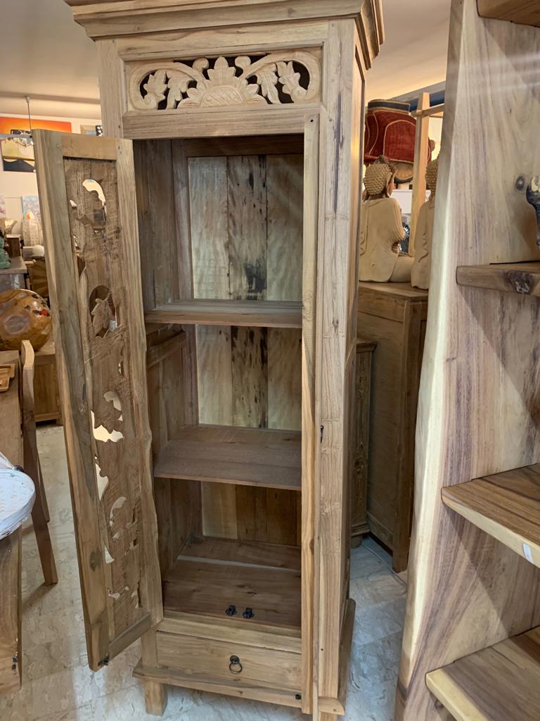 Armadio a stipo dalla linea etnica – orientale. Prodotto artigianale in Teak massello riciclato che sottolinea le venature del legno e intagliato a mano. Armadio elegante e ricercato, internamente ampio e capiente presenta tre ripiani e 1 cassetto ed è versatile e perfetto in ogni ambiente: dall’ingresso come elegante scarpiera, alla zona bagno come armadietto porta-asciugamani, magari in abbinata a una consolle dello stesso stile.