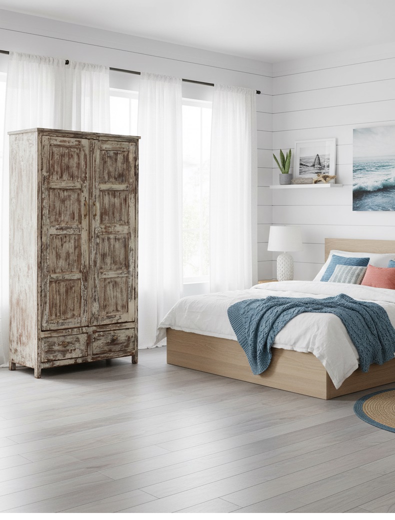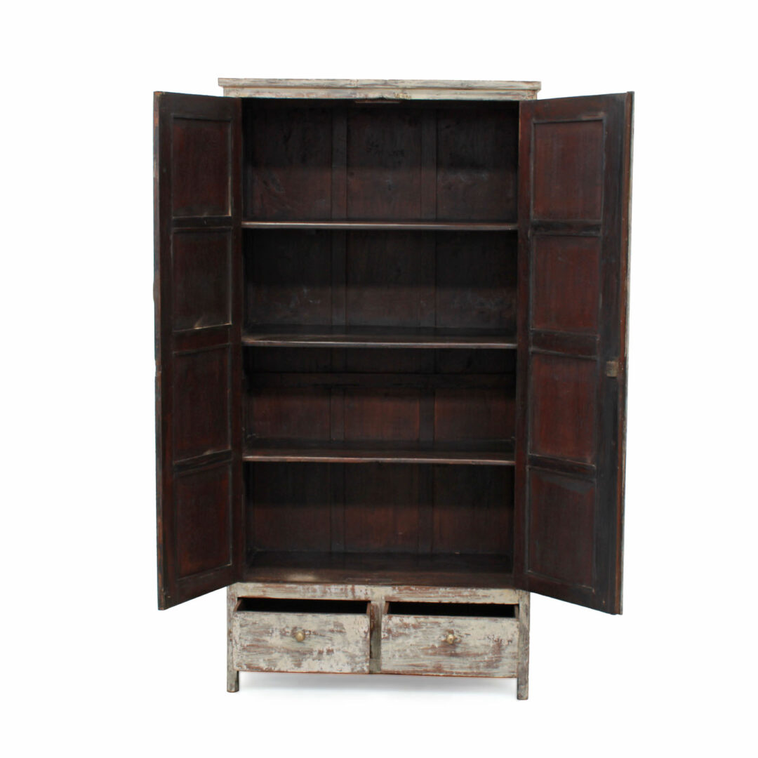 Armadio Stipo Home  , armadio in legno teak massello, decapato bianco.. Composto da 2 ante con mensole all’interno..