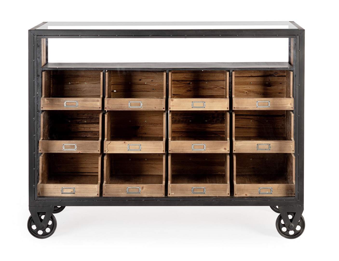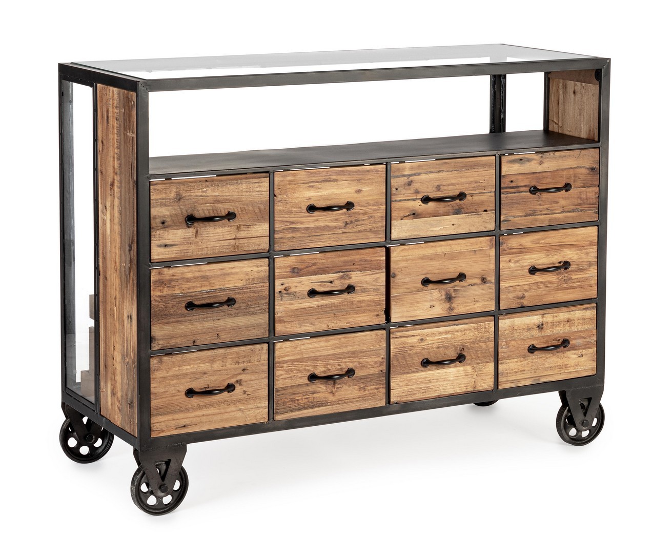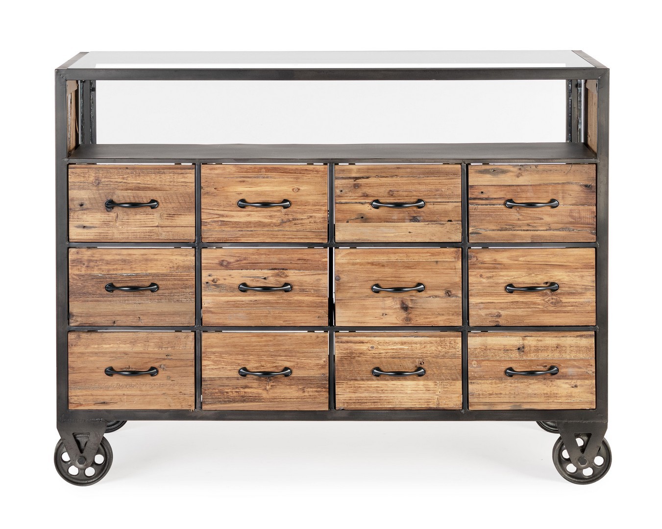 Cassettiera 12C Mindil C-Ruote, originalissima cassettiera con 12 cassetti, struttura in acciaio verniciato a polvere. Il ripiano è in vetro. I cassetti sono costruiti in legno di abete. Ruote in gomma.