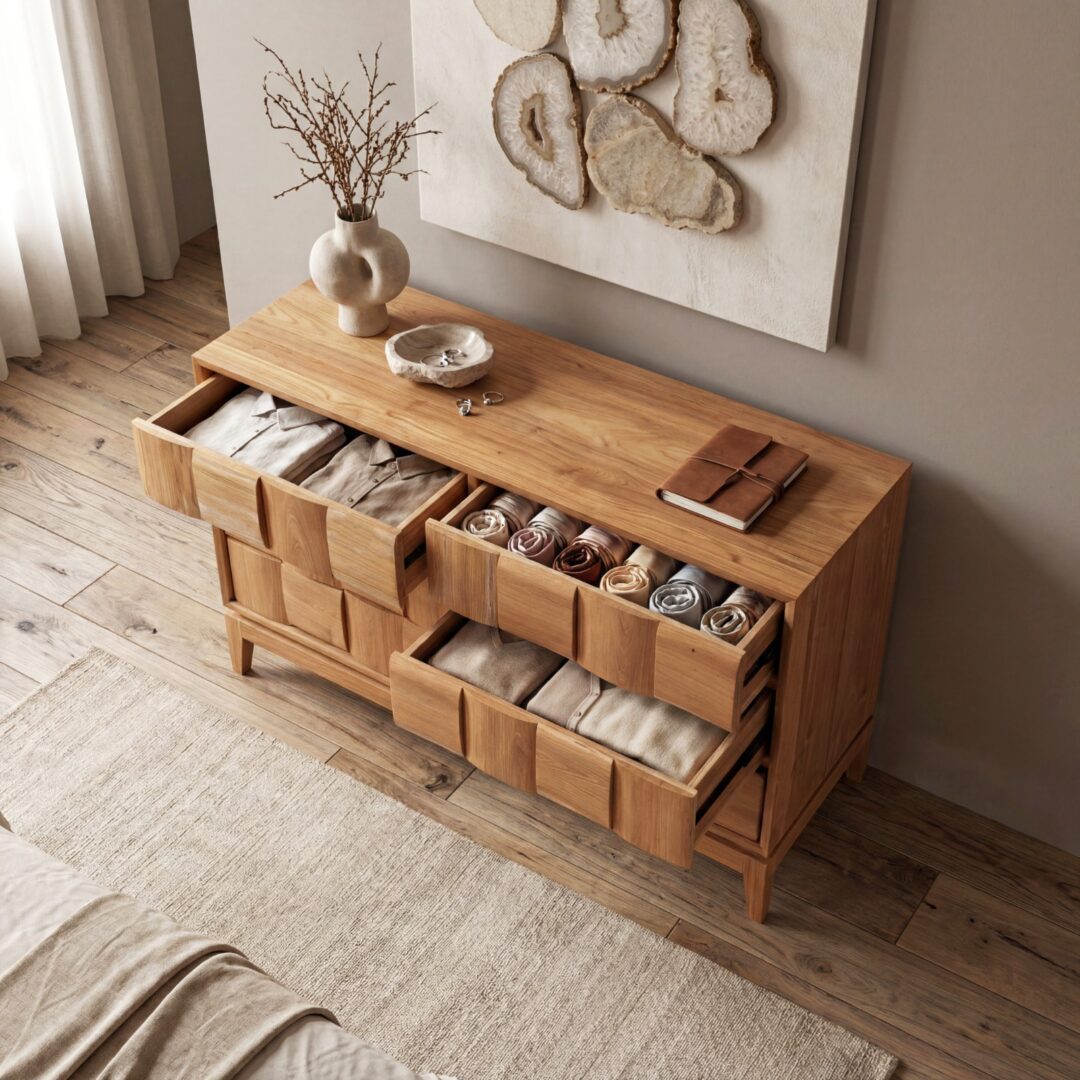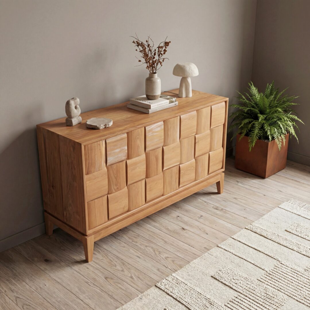 Cassettiera Dune 6Css, Questo maestoso comò in legno massello di teak rappresenta un’eccellenza dell’artigianato etnico.