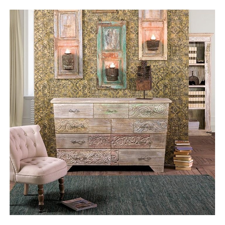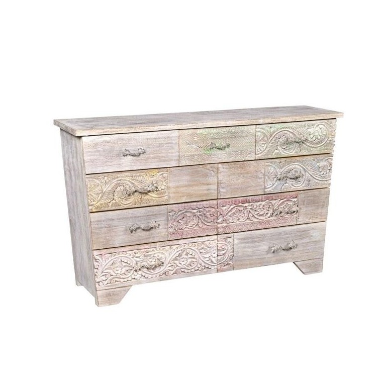 Cassettiera Namastè, in legno massello di acacia riciclato con 9 cassetti intagliati con motivi floreali. arreda la camera da letto con un mobile unico e pregiato ,uno stile orientale ed etnico da rendere la tua camera da letto uno spazio molto personale.la cassettiera namaste è fatta tutta a mano da artigiani indiani Infatti ogni cassettiera può presentare colorazioni e intagli leggermente differenti in quanto ricavato da parti di legno veramente originali. Adatta anche per altri spazi della casa .. in stile moderno, shabby chic e provenzale.