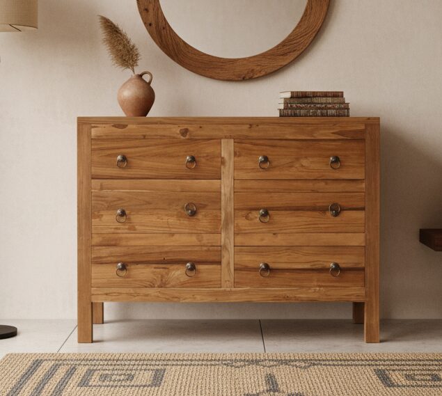 Cassettiera Teak Ric 6Css in legno massello di Teak rappresenta un capolavoro artigianale, progettato per chi ricerca un complemento d’arredo che unisca l’anima calda del legno alla raffinatezza del design d’ispirazione orientale.