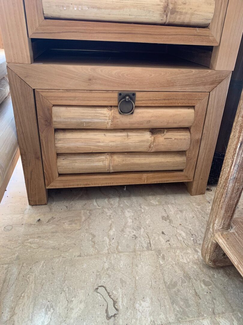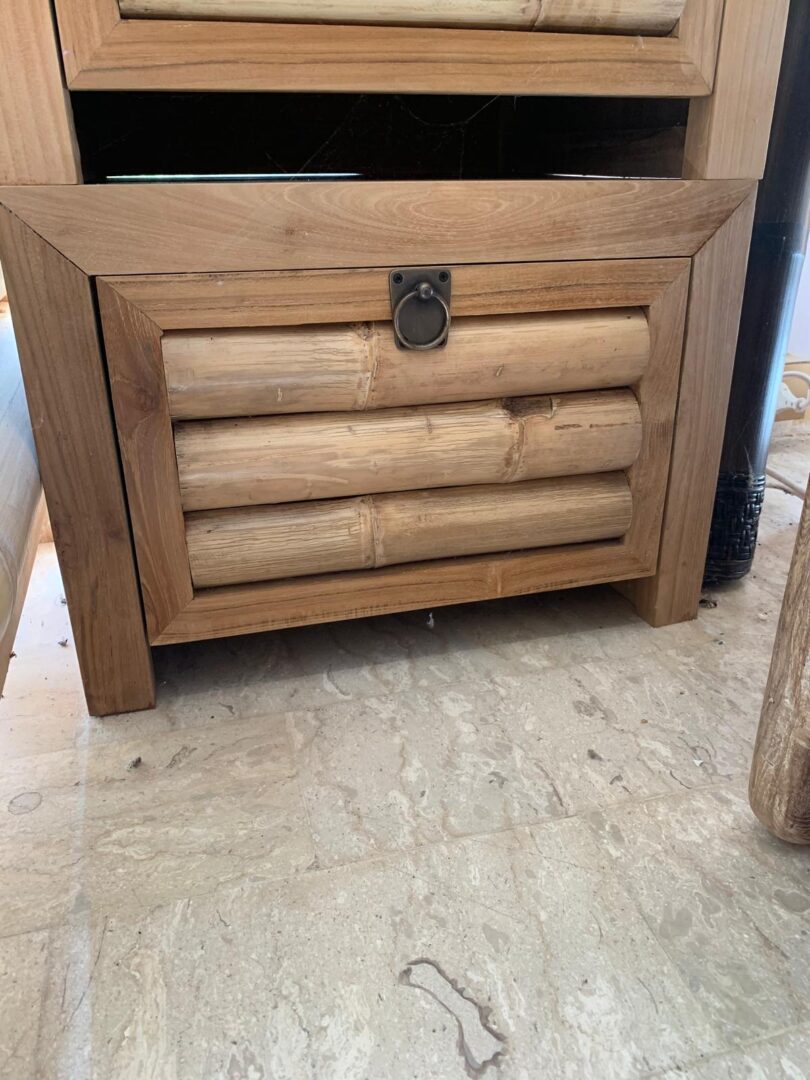 Questo comodino è dotato di 1 cassetto con vere canne di bambù, la finitura è a cera permettendo di conservare intatte le caratteristiche naturali tipiche del legno di Teak.