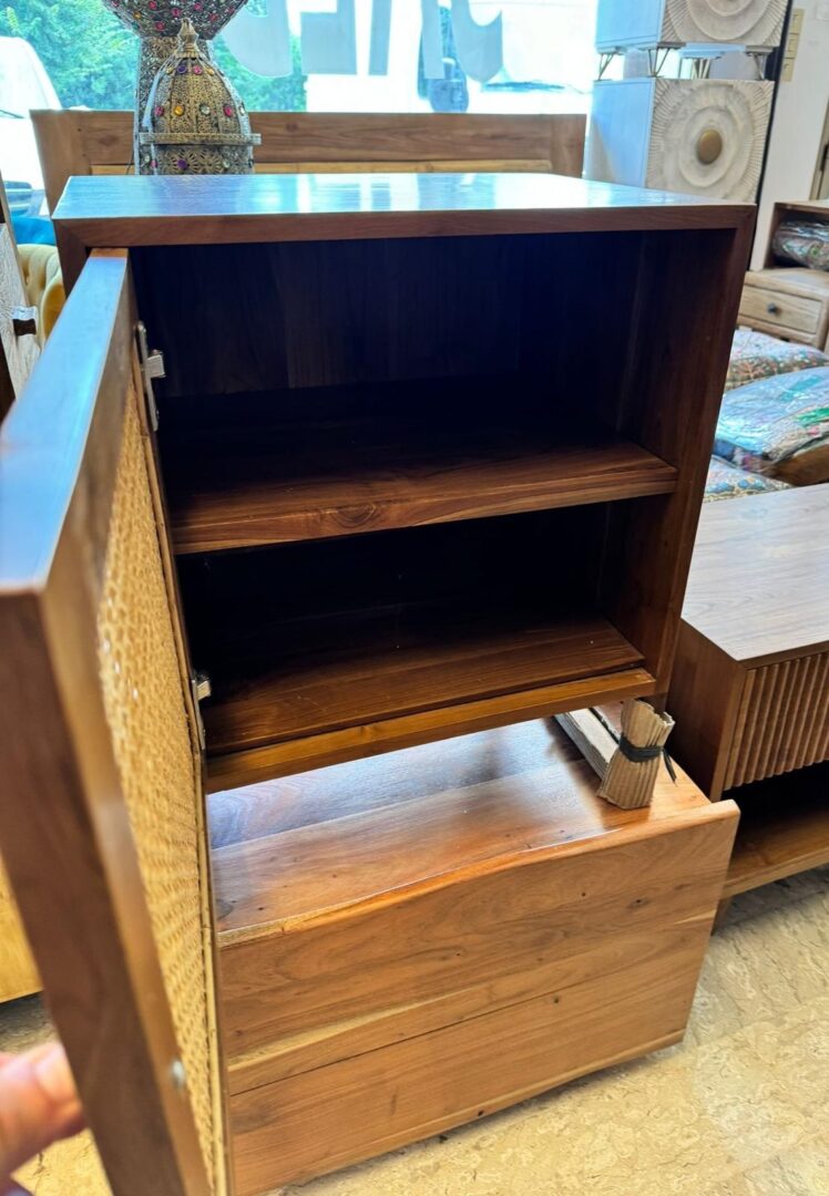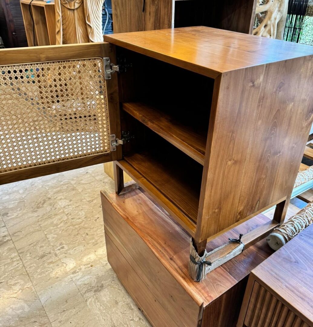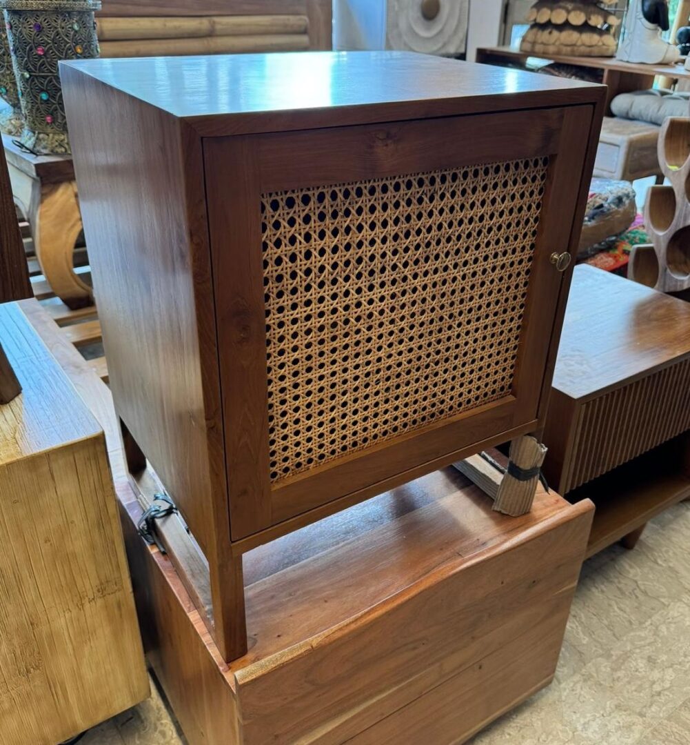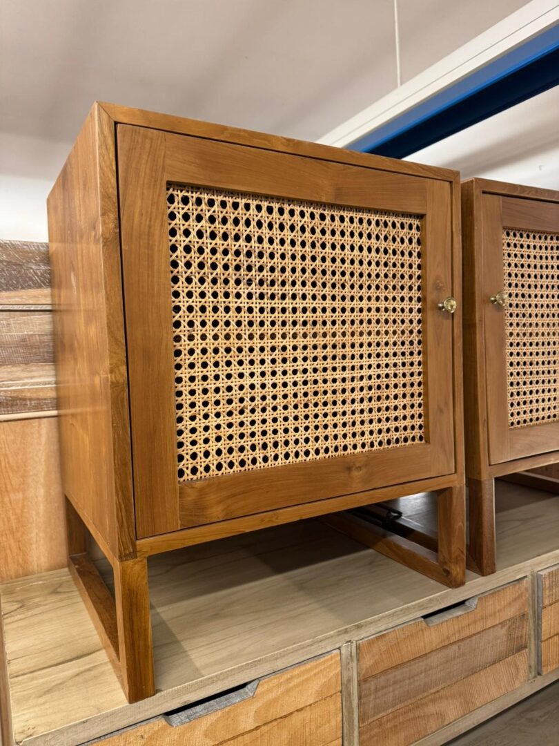 Comodino in legno massello di teak naturale, realizzato interamente a mano. Questo comodino è dotato di 1 anta con frontale in rattan, la finitura è a cera.