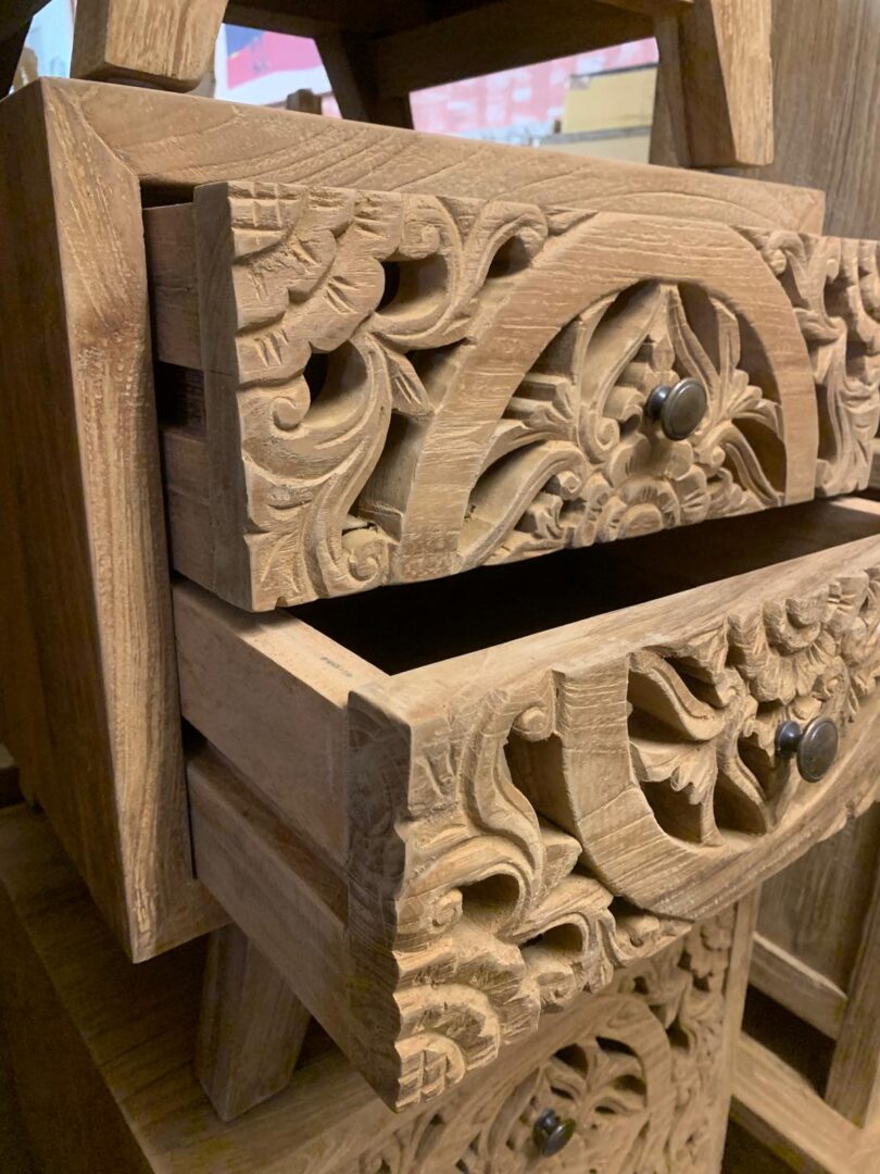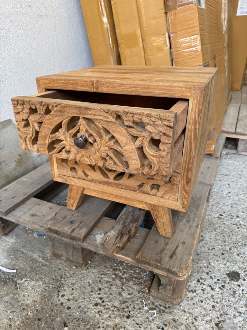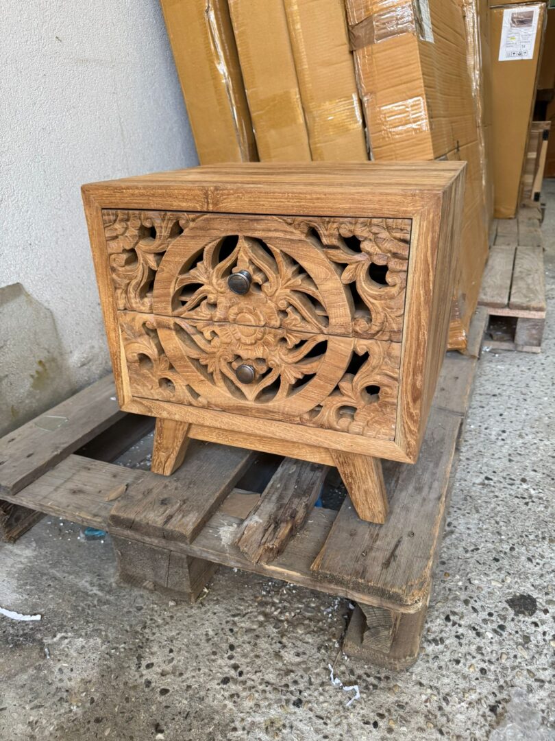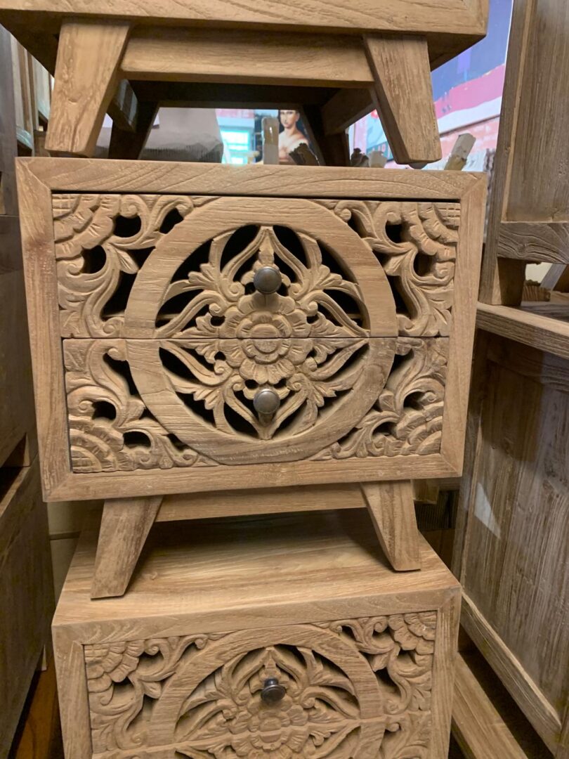 Comodino Teak Ric. 2Css, in legno massello di teak riciclato, realizzato interamente a mano. Cassetti finemente intagliati a mano.