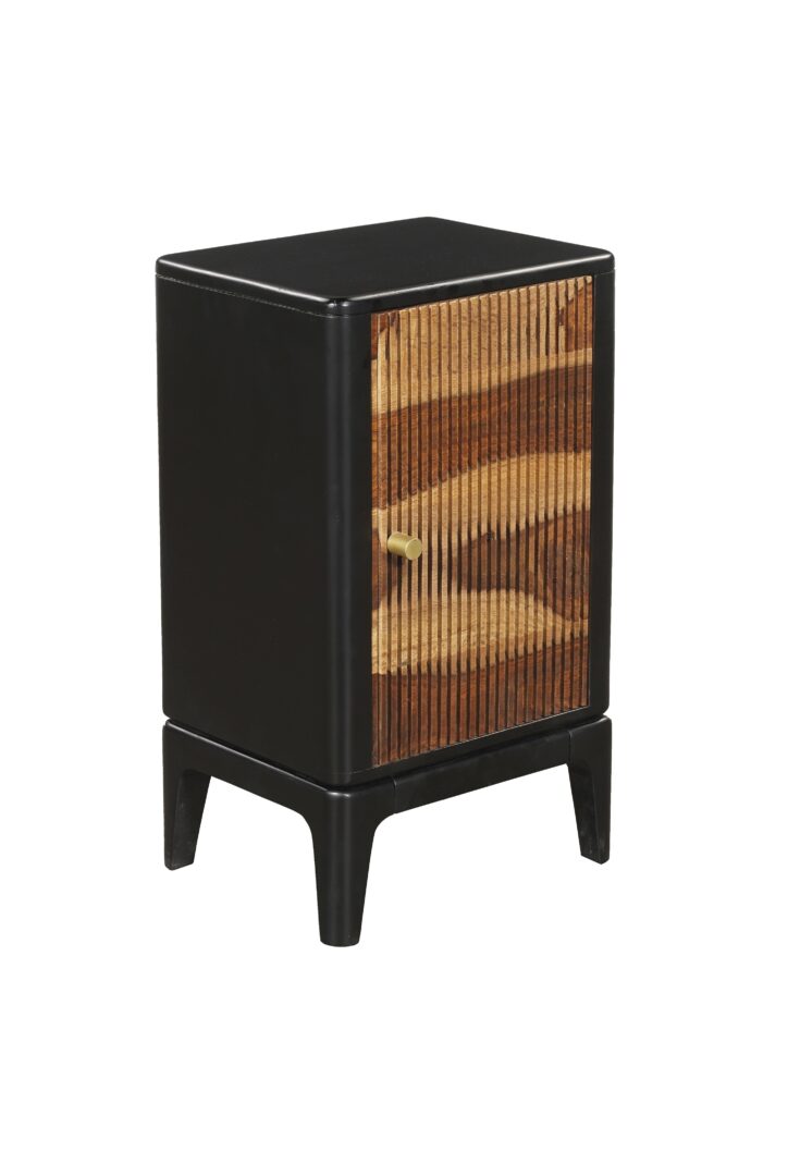 E’ ideale in contesti d’arredo moderni e contemporanei, ma soprattutto Industrial. La struttura è in legno massello di acacia, colore nero con anta in colore legno.  E’ composto da 1 anta lavorata a mano per donare un effetto ancora più naturale e vivo del legno. La lavorazione artigianale di questo originale comodino è lavorato a mano e proprio perché artigianale ogni pezzo è unico con le proprie particolarità.