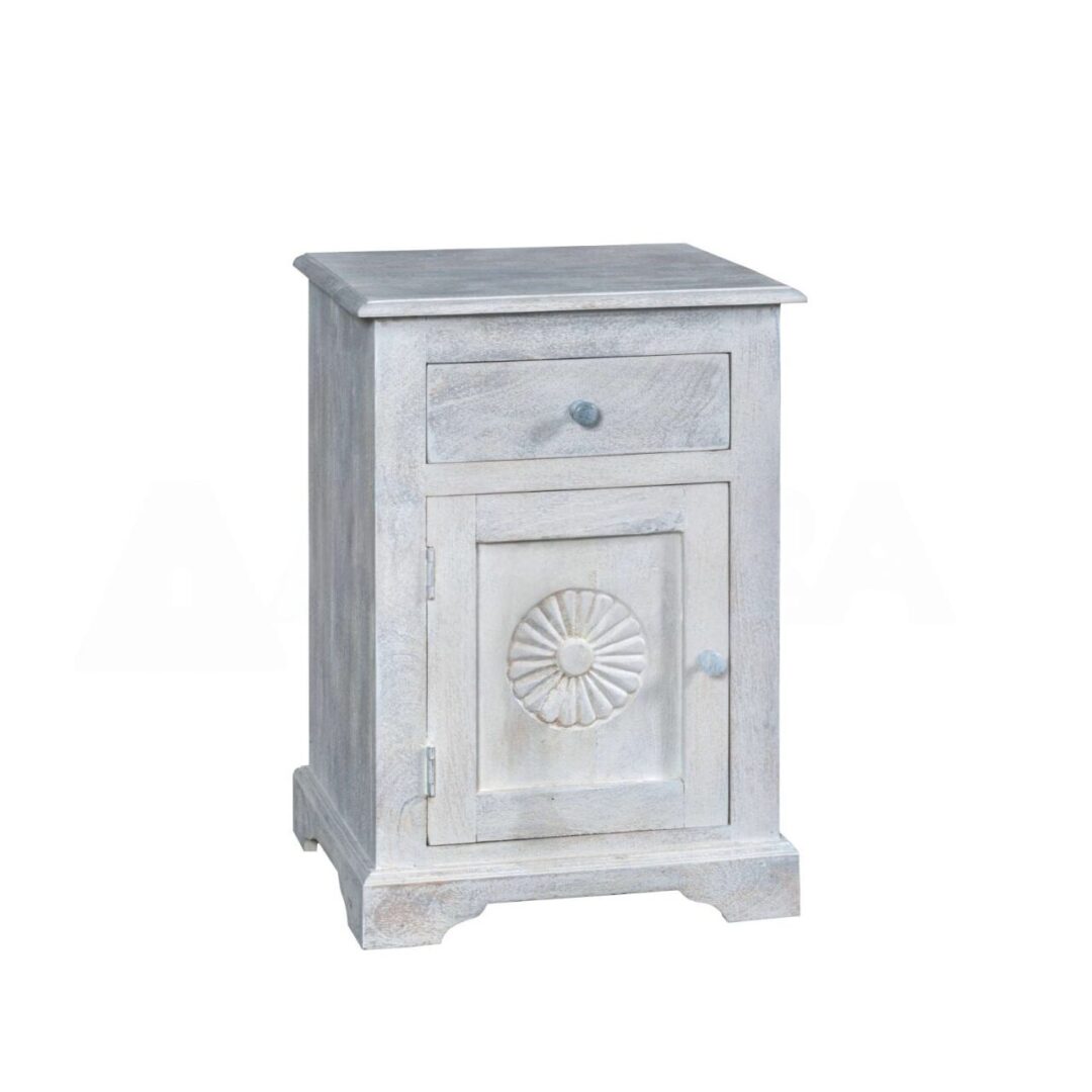 Comodino White Sun , mobile dalle linee essenziali ,arricchiti da un intaglio che conferisce originalità ad armonia. Il colore chiaro rende questi elementi di arredo adatti ad ogni ambiente. Comodino costruito artigianalmente in legno massello di acacia, colore bianco decapato.