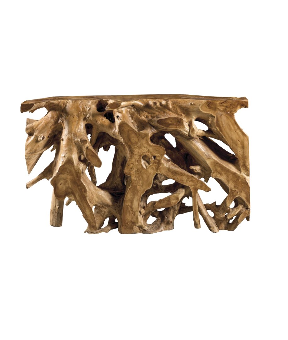 Elementi di arredo realizzati con le radici di secolari alberi di teak. La radice viene pulita e lavorata il meno possibile, proprio per lasciare intatto il frutto del tempo e della natura.