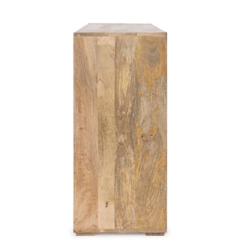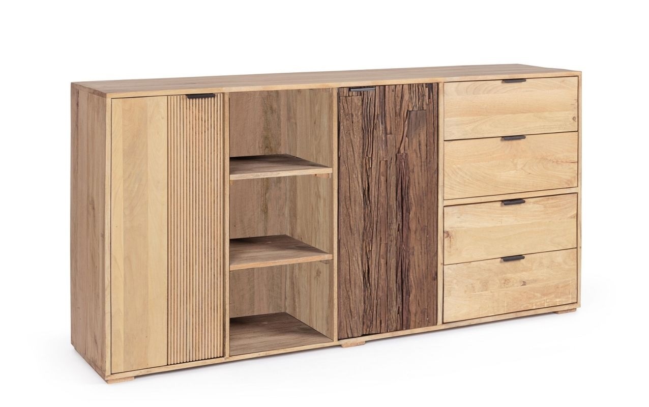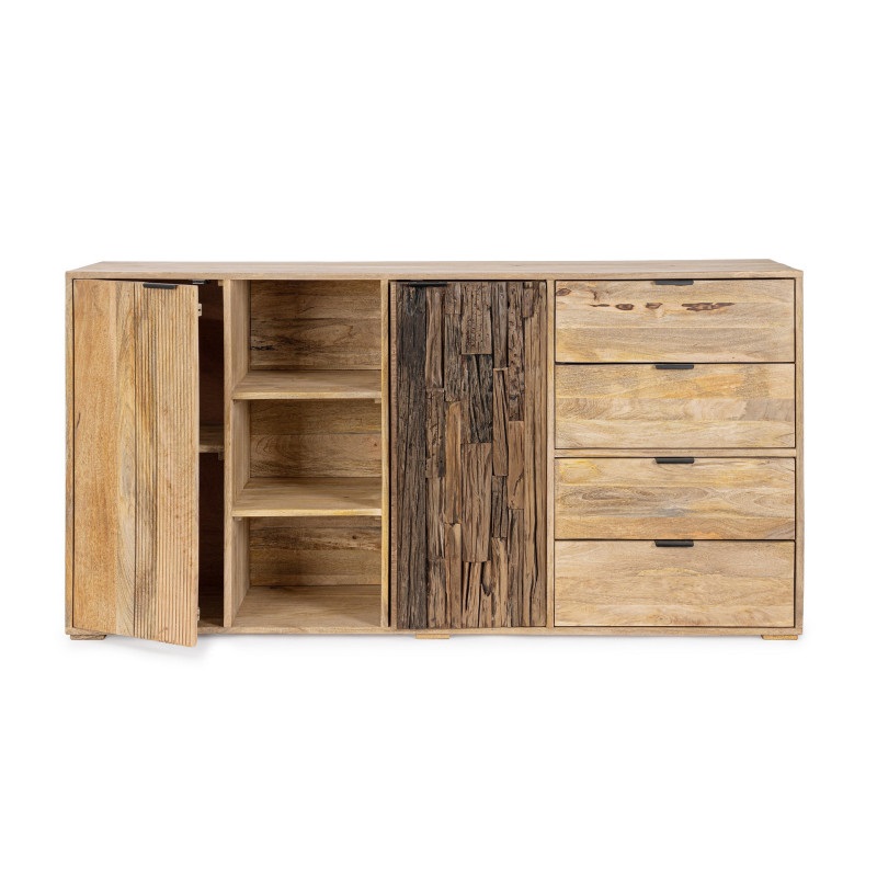 Credenza 2A-4C Nashik  , originale mobile in legno massello . Composto da 2 ante  in legno e legno riciclato. Finitura acrilica protettiva. Maniglie in metallo. Prodotto in legno riciclato caratterizzato dalla presenza di tasselli in legno di diverse specie e colore.