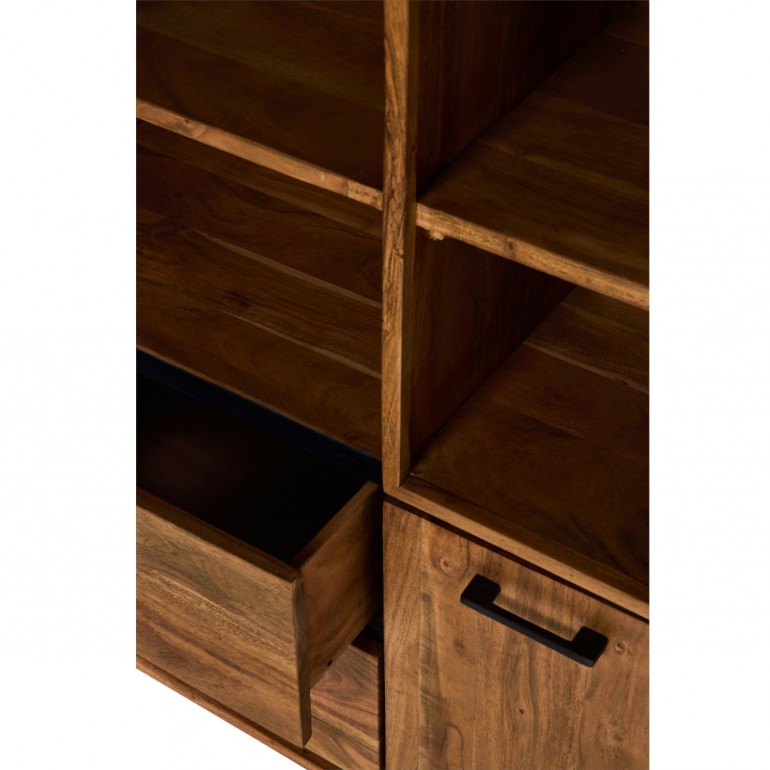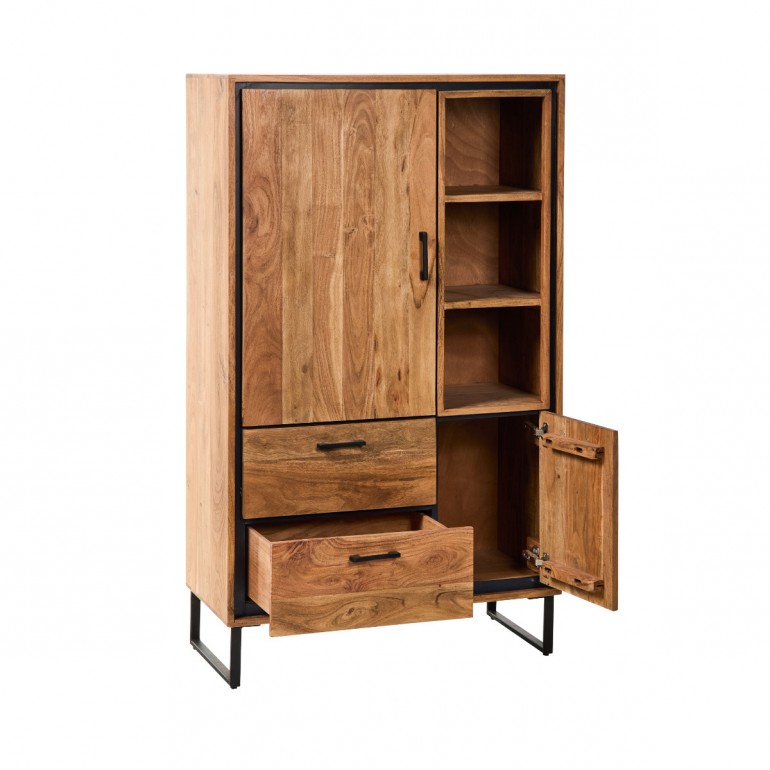 Credenza Alta Farlez , costruita interamente in vero legno massello di acacia. Composta da 2 ante con maniglia in ferro e mensola interna, 2 cassetti e 2 ripiani a giorno.