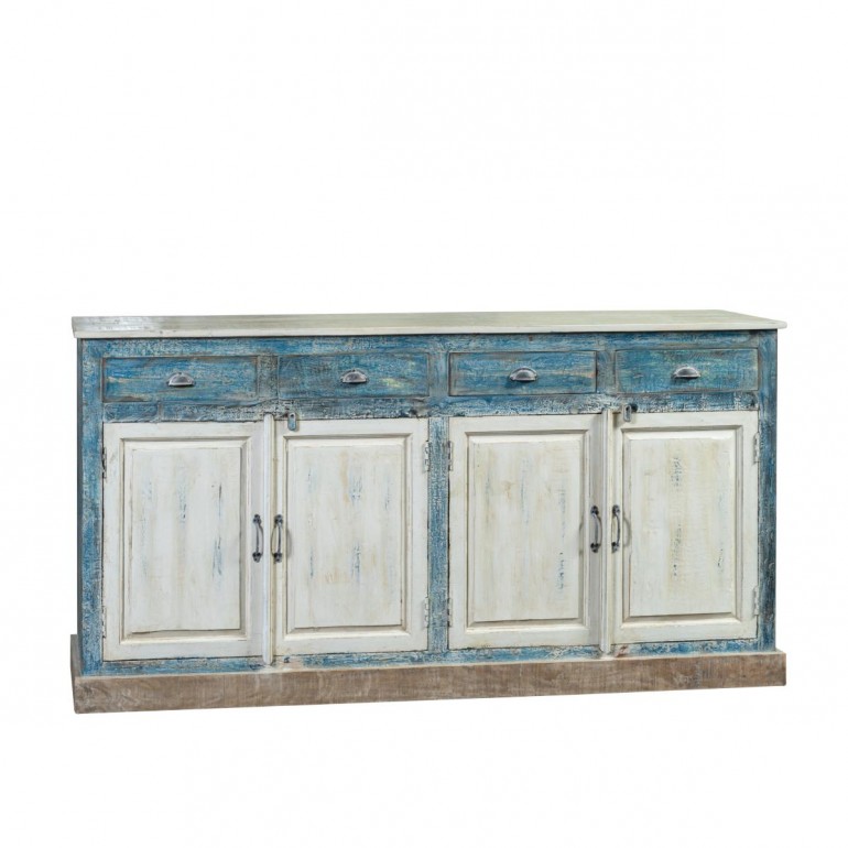 Credenza Biarritz 4a+4css , in legno massello di mango lavorato artigianalmente colore azzurro decapato bianco.