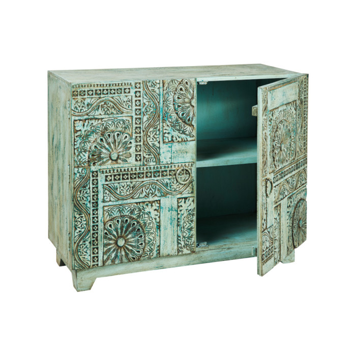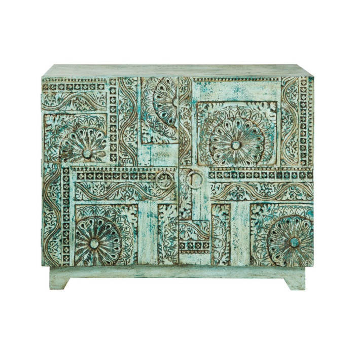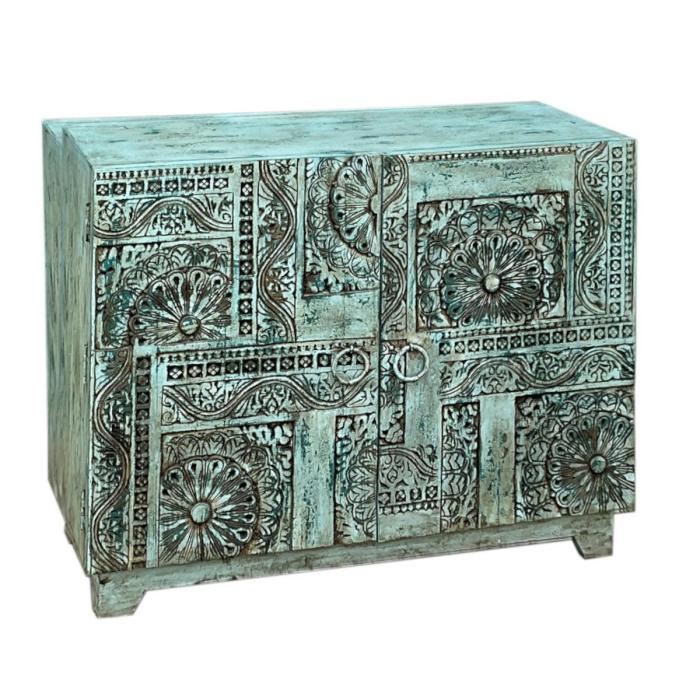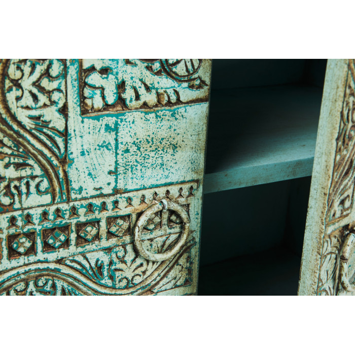 Aggiungi un’eleganza dal sapore orientale ai tuoi spazi con questa credenza in legno di mango, finemente scolpita a mano. Un complemento d’arredo che spicca per il suo stile distintivo e intramontabile, ideale per valorizzare qualsiasi ambiente della casa. La superficie, rifinita con un effetto anticato in una delicata sfumatura verde-azzurra, arricchita da dettagli vintage, dona un aspetto autentico e ricco di carattere artigianale. Ogni credenza è un pezzo unico, decorato con motivi floreali e geometrici che evidenziano la maestria della lavorazione manuale.