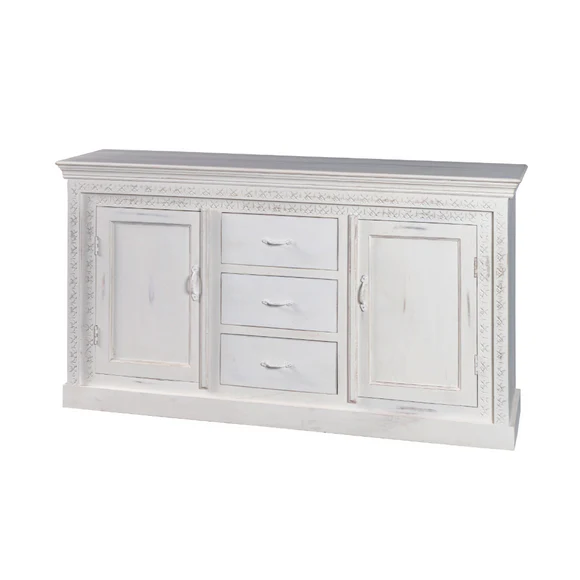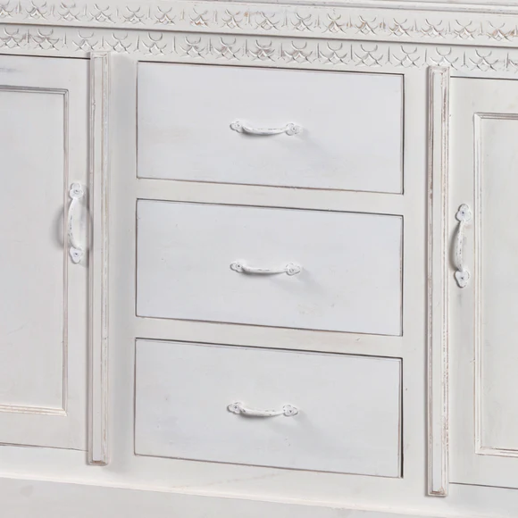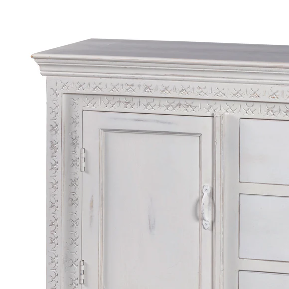 Questa madia è realizzata con legno massello di mango, noto per la sua robustezza e durabilità, assicurando un mobile che durerà nel tempo. Il design sofisticato, arricchito da una finitura bianco decapato, dona un aspetto vintage e raffinato che si integra perfettamente con qualsiasi arredamento.