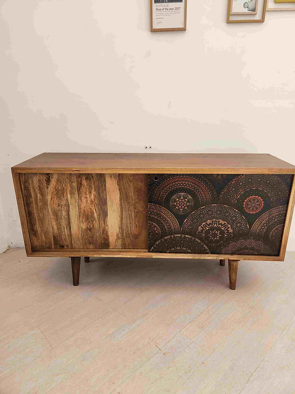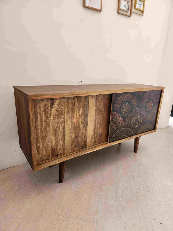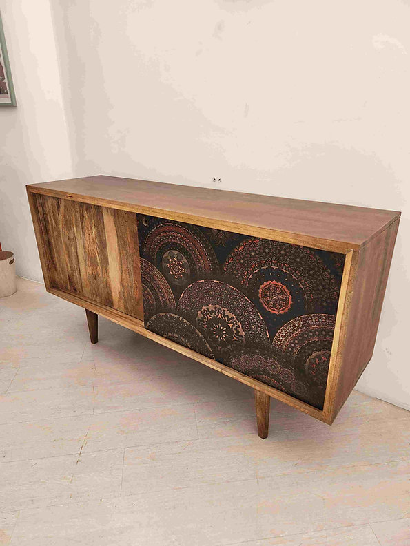 Credenza Etnica Christina ha la struttura in legno massello ,con una lavorazione di mandala indiani  E’ composta da 2 ante scorrevoli  centrali con maniglia a foro nella estremita’ alta dell’anta , Questa madia ha uno stile minimal oriental  ed e’ molto particolare grazie alle sue ante multicolore come si vede dalla foto.