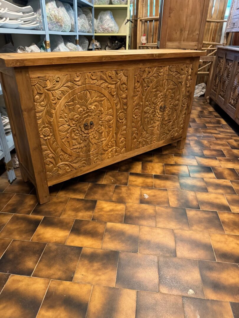 Credenza Etnica Teak 4a, Credenza in teak massello intagliata a mano da artigiani indonesiani, con mensola interna. Credenza interamente costruita in legno di teak massello, robusta e capiente. Dispone di 4 ante impreziosite da intagli lavorati a mano. Questa credenza è adatta anche per arredare il vostro bagno, con uno stile etnico orientale originale.