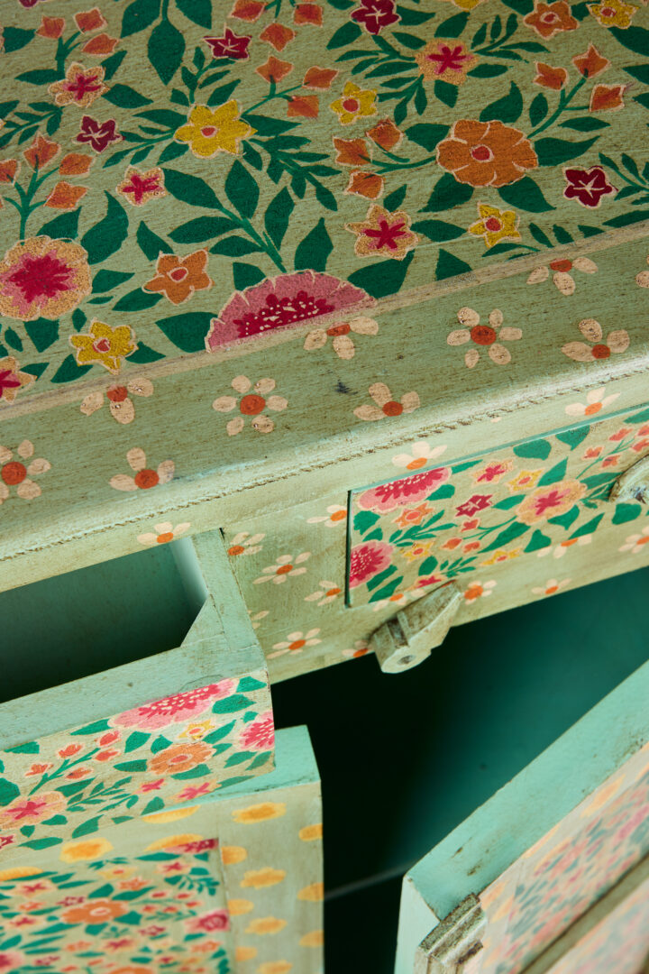 Costruita in vero legno massello di mango, noto per la sua robustezza e durabilità. Superficie  dipinta a mano con motivi floreali multicolore.