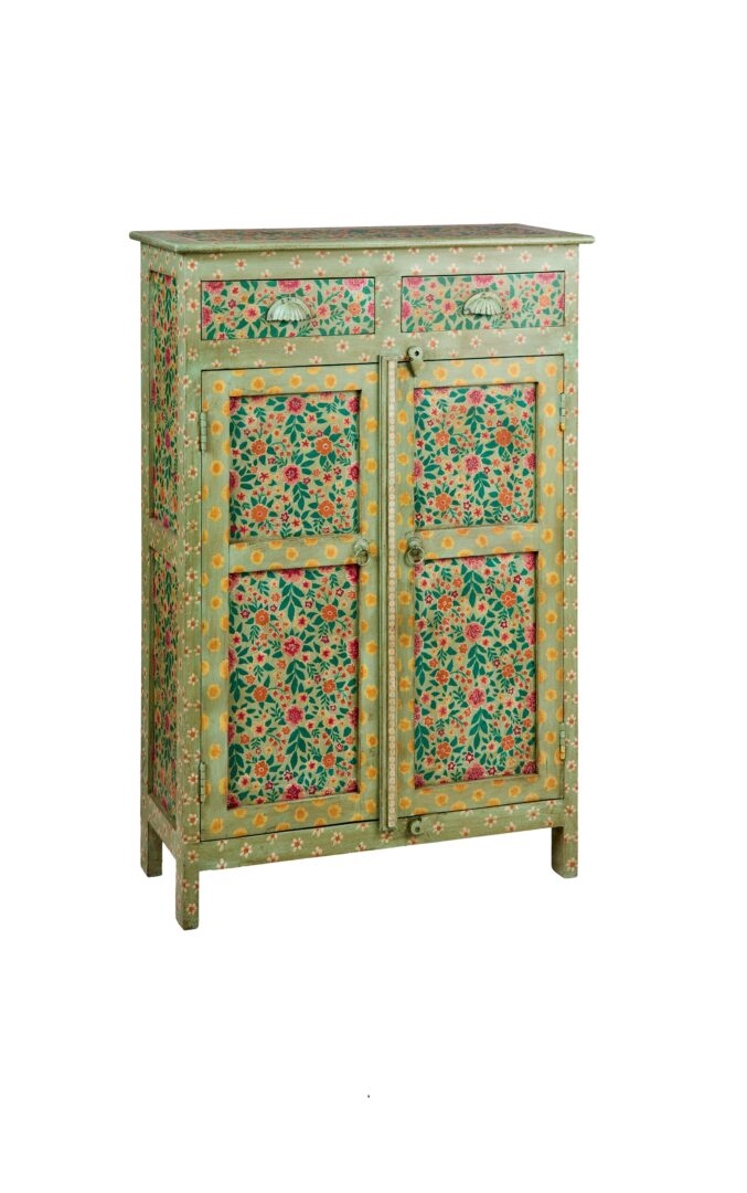 Credenza Frida Alta Verde , credenza in vero legno massello di mango composta da 2 ante con mensola interna e 2 cassetti.