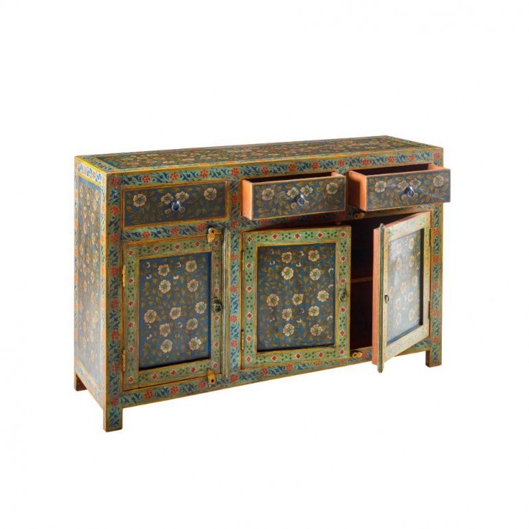 Credenza Frida Blu 3A-3Css , credenza in vero legno massello di mango composta da 3 ante con mensola intera e 3 cassetti.