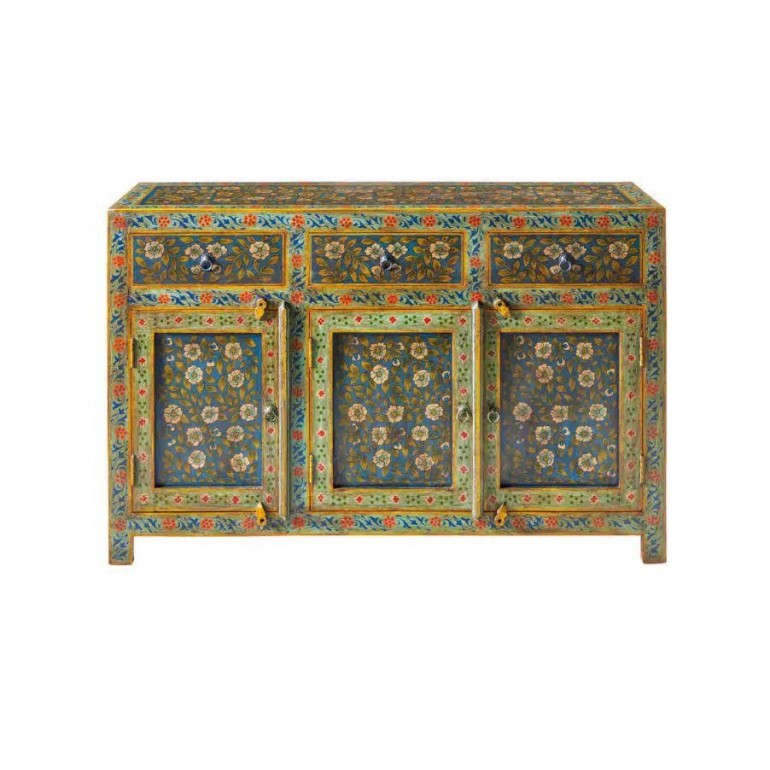 Questa Credenza è un pezzo d’arredo che unisce funzionalità e design artistico, perfetta per chi desidera aggiungere un tocco di originalità e colore alla propria casa. Realizzata in legno massello di mango, questa credenza presenta una superficie finemente intagliata e dipinta a mano con motivi floreali, richiamando l’estetica boho-chic e l’artigianato tradizionale.