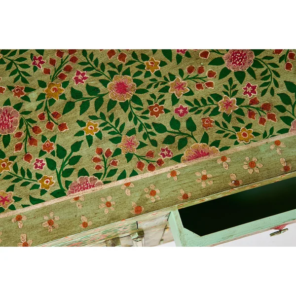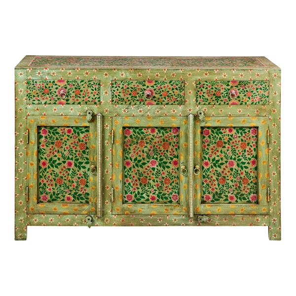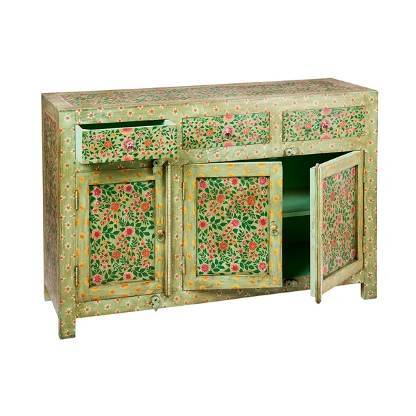 Questa Credenza è un pezzo d’arredo che unisce funzionalità e design artistico, perfetta per chi desidera aggiungere un tocco di originalità e colore alla propria casa. Realizzata in legno massello di mango, questa credenza presenta una superficie finemente intagliata e dipinta a mano con motivi floreali, richiamando l’estetica boho-chic e l’artigianato tradizionale.