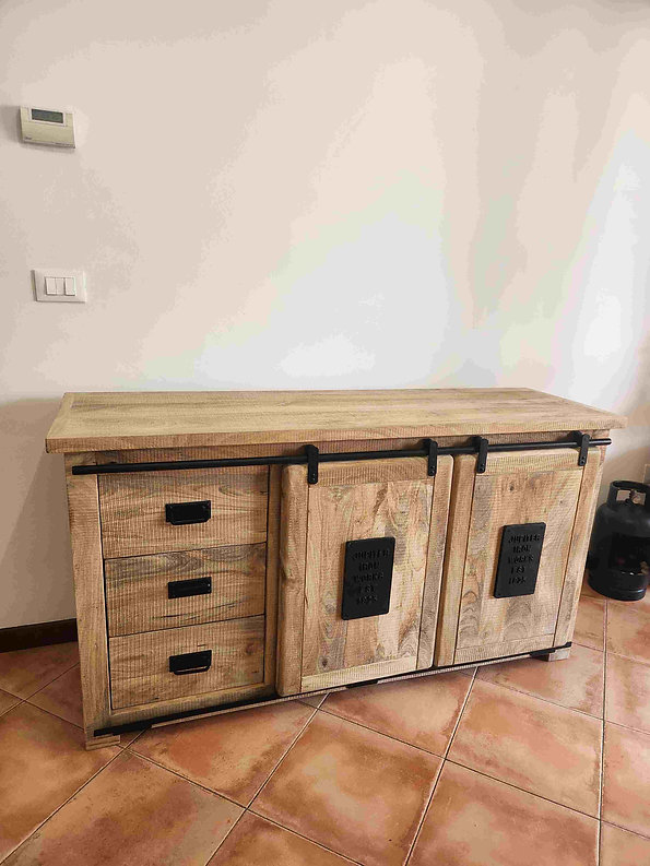 Madia composta da 3 cassetti e 2 ante scorrevoli. Anche nella versione riciclata colorata.