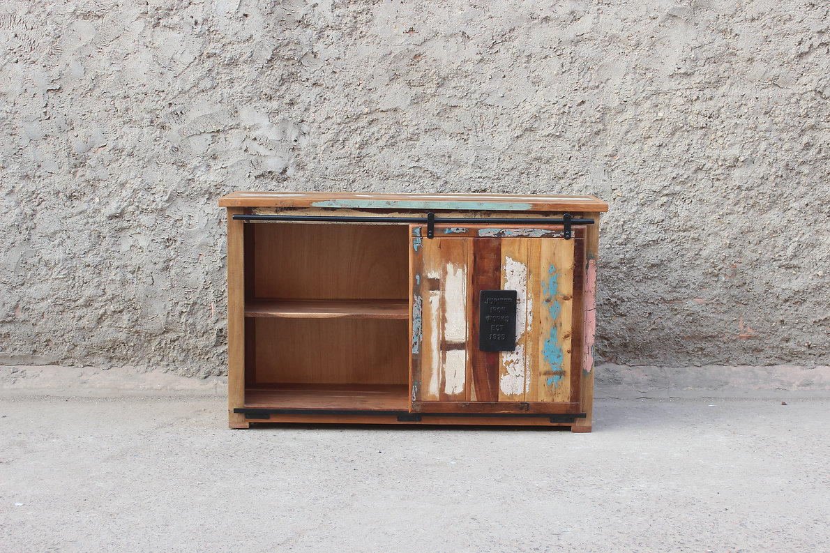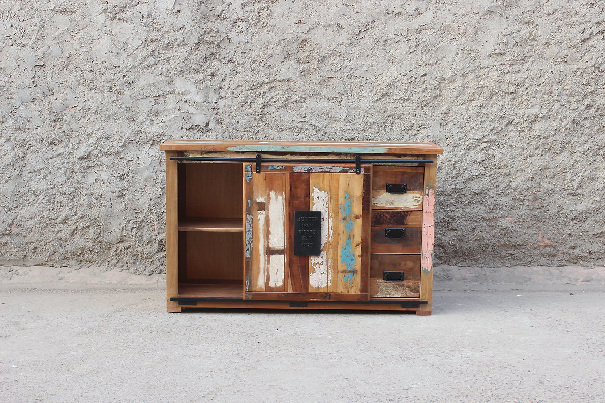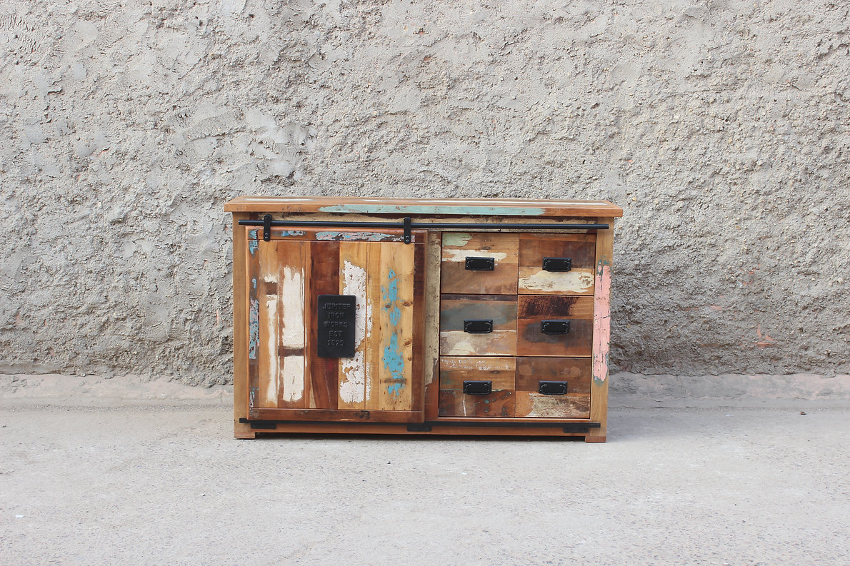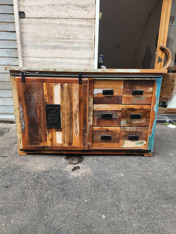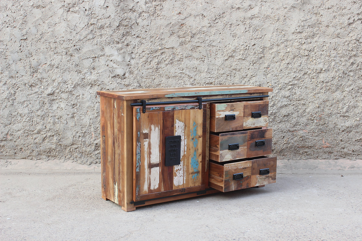 Credenza Jupiter Riciclo 140 , realizzata in legno massello riciclato con dettagli in ferro e ghisa.