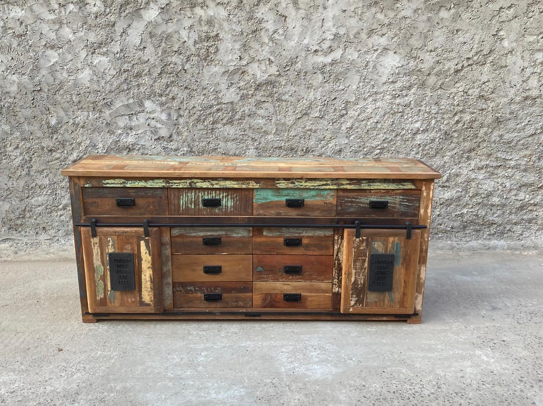 Credenza Jupiter Riciclo 200 realizzata in legno massello riciclato con dettagli in ferro e ghisa.