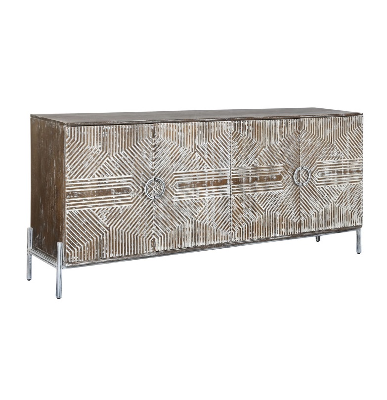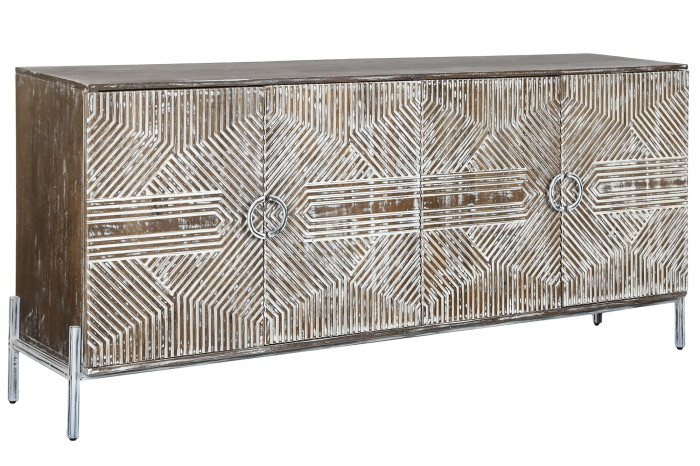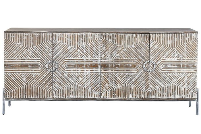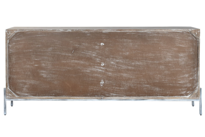 Realizzata artigianalmente, questa credenza presenta una finitura decapata che esalta le venature naturali del legno, donandole un aspetto vissuto e vintage, tipico del design etnico e shabby chic. La sua ampia superficie e i pratici vani contenitori la rendono ideale per organizzare con stile soggiorni, ingressi o camere da letto.