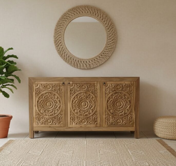 Credenza Namastè Teak 3A in legno massello di teak rappresenta un tributo all’arte dell’ebanisteria e alla spiritualità del design orientale.