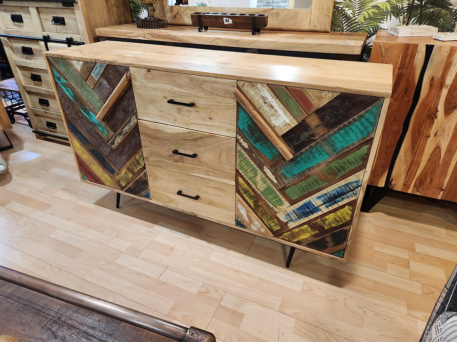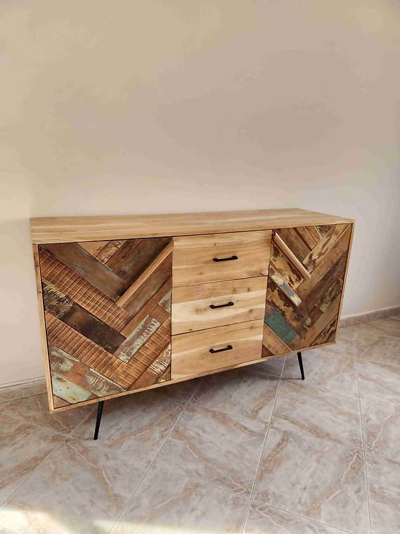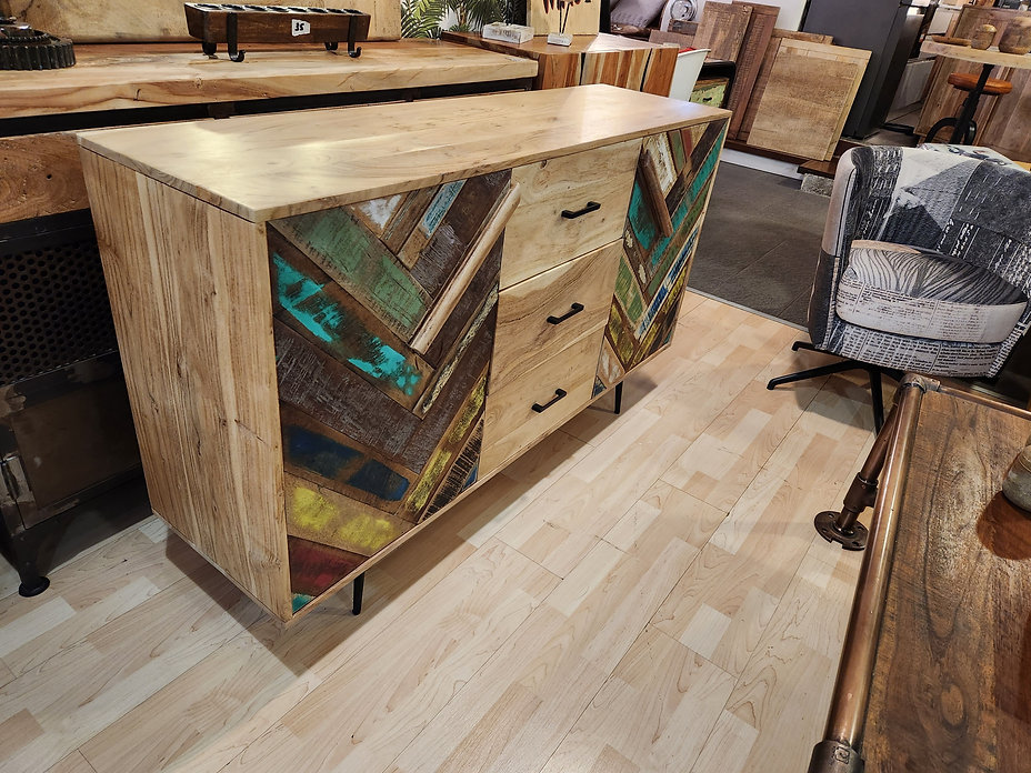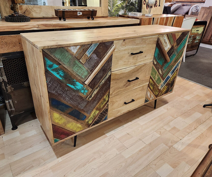 Credenza Rennes Natura 145 , ha la struttura in legno massello. E’ composta da 2 ante con mensola interna e 3 cassetti con maniglia nella parte centrale del mobile. Questa madia ha uno stile industriale ed è molto particolare grazie alle sue ante bicolore a spina di pesce.