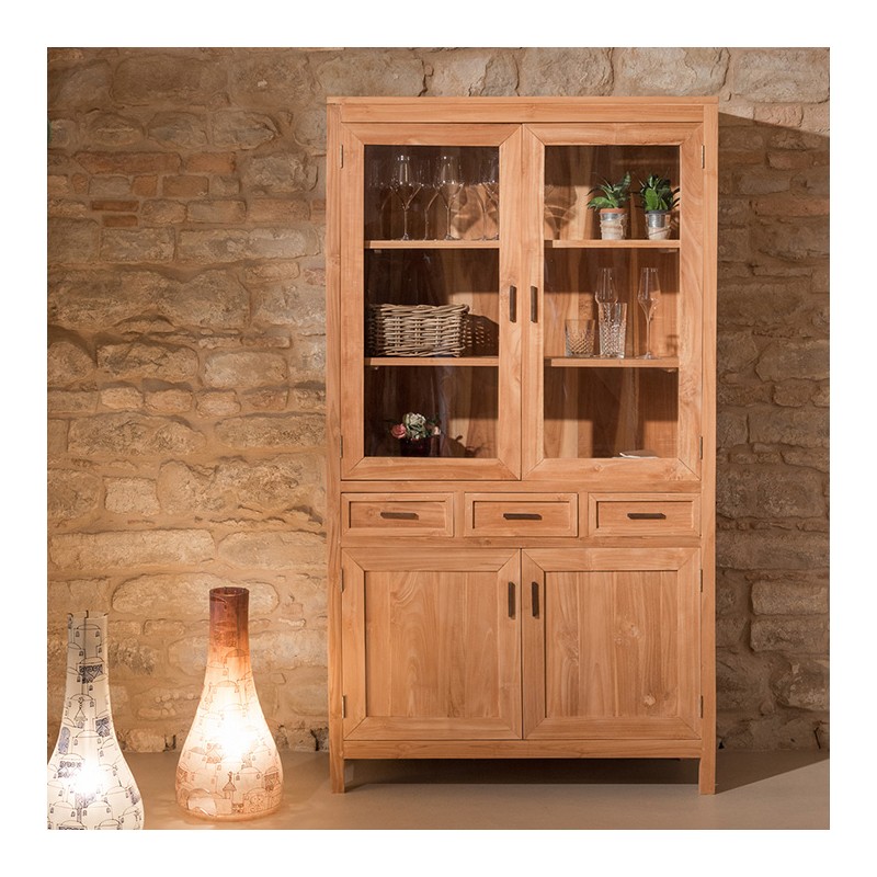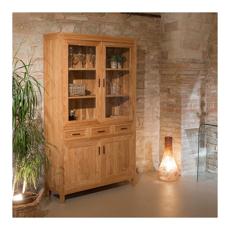 Il Teak grazie alle sue proprietà fisiche uniche, è garanzia di resistenza e longevità, questo è un prodotto solido e realizzato a mano. La vetrina è composta da 2 ante nella parte inferiore, 3 cassetti nella parte centrale, 2 ante a vetro nella parte superiore