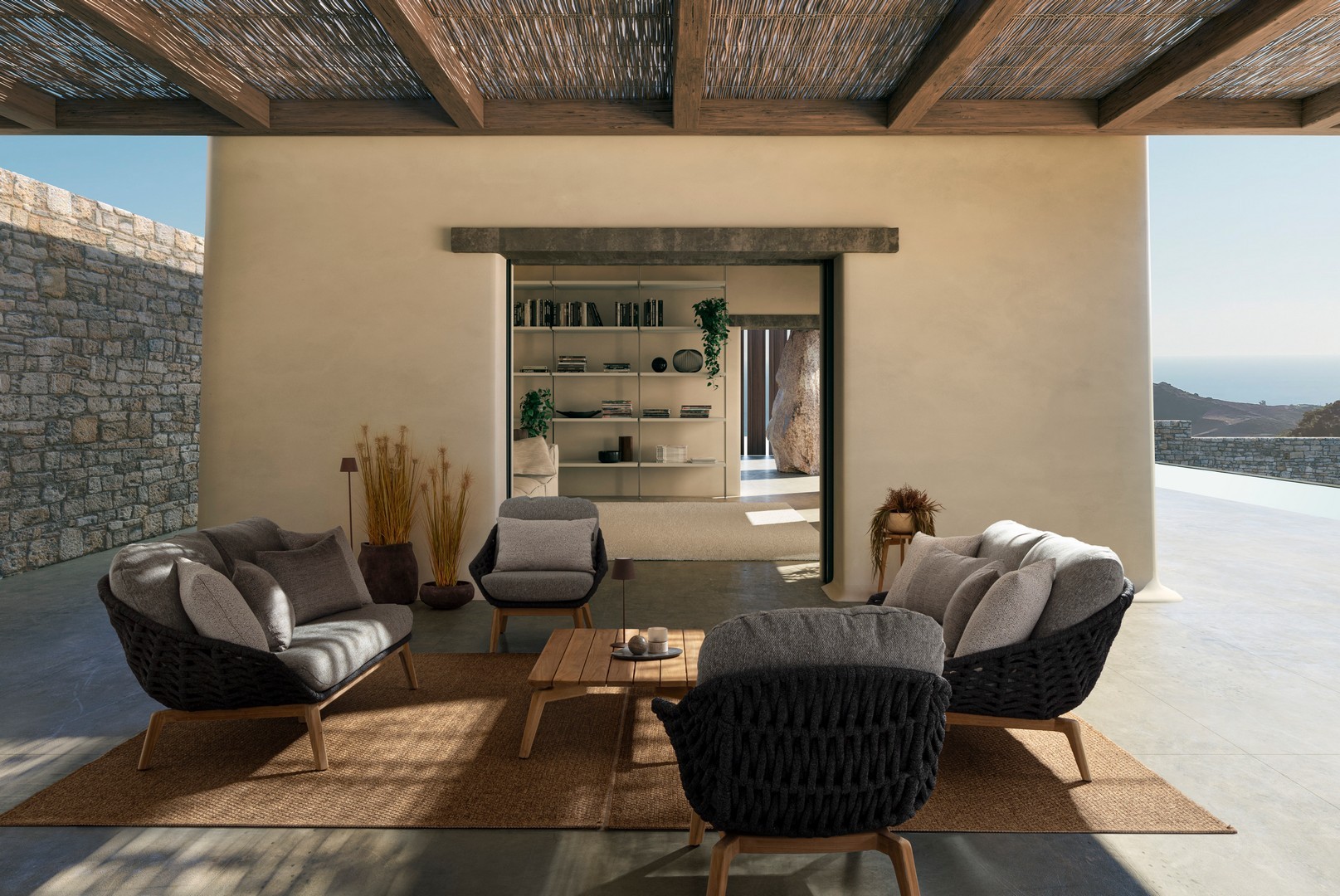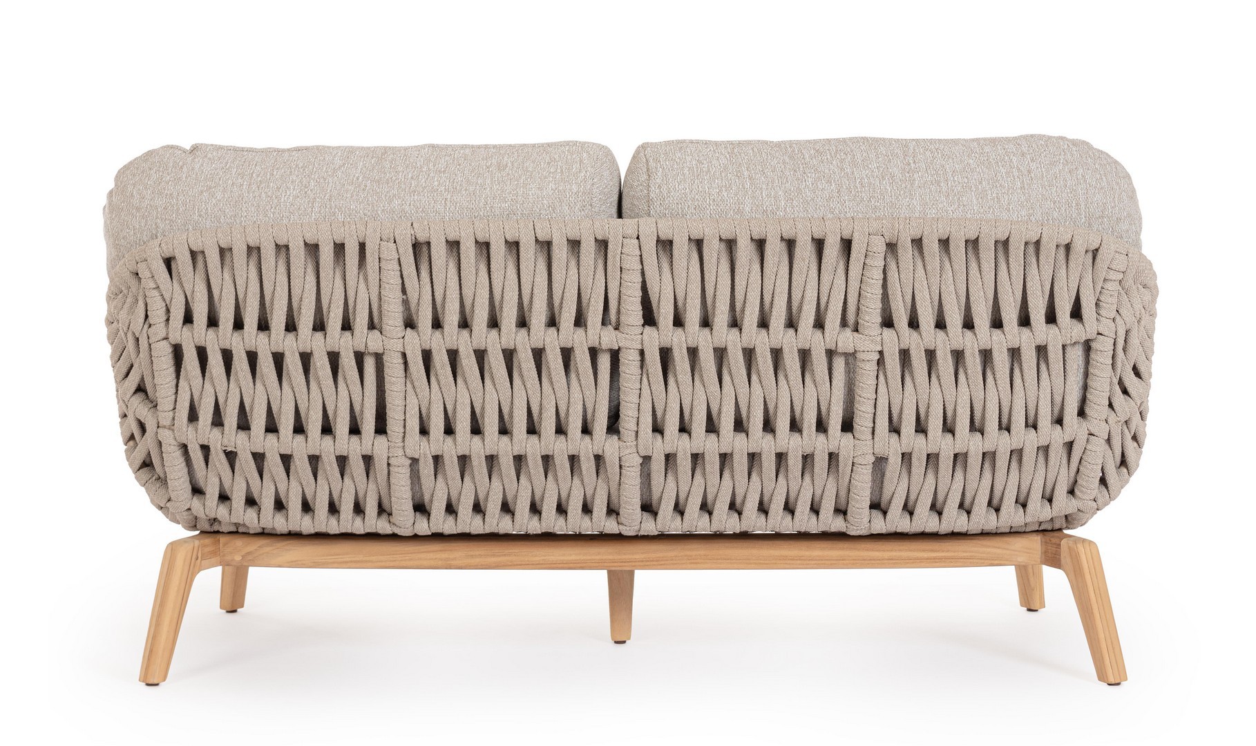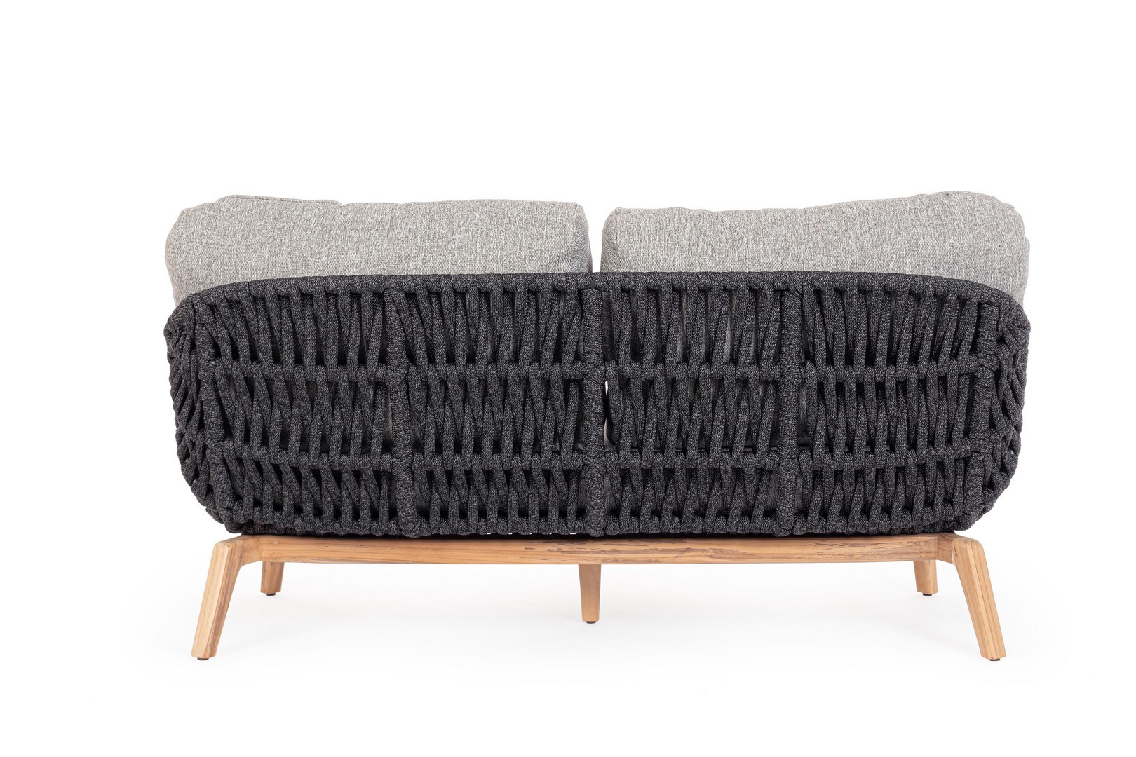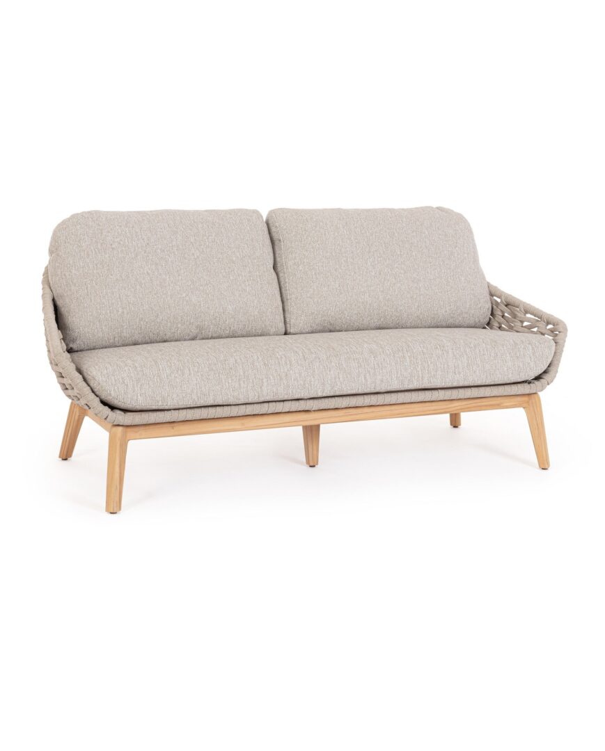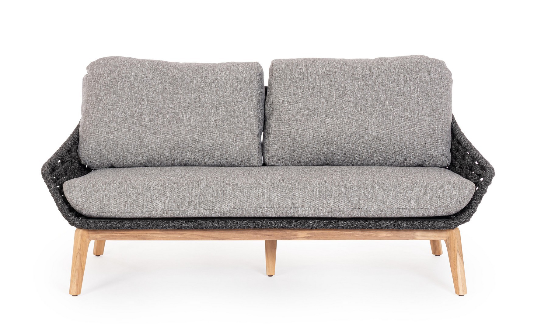 Struttura del divano in alluminio verniciata a polvere (poliestere). Intreccio per esterno in corda olefin (100% polipropilene). Cuscino seduta e schienale sfoderabile con tessuto idrorepellente sunproof olefin (100% polipropilene). Gambe in teak – svlk (legno certificato proveniente da foreste sostenibili). Viteria in acciaio inossidabile. Gambe da assemblare.