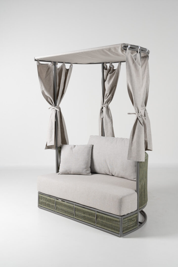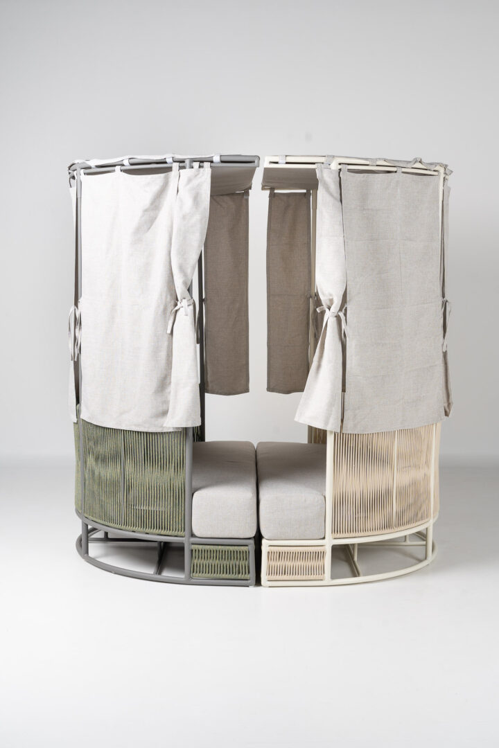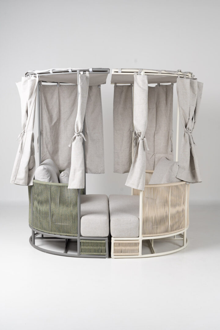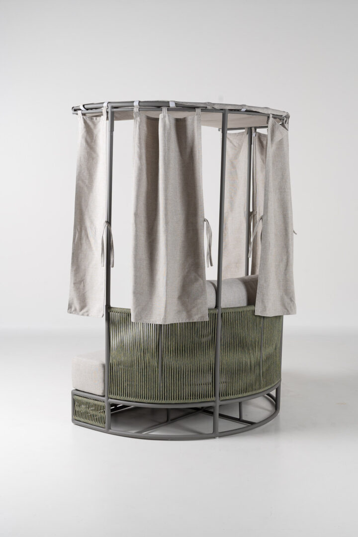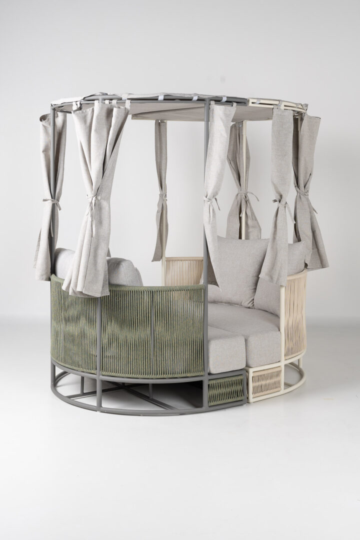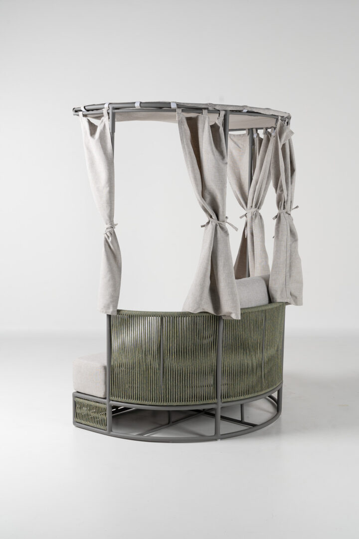 La struttura portante è realizzata in alluminio pre-verniciato, una scelta tecnica che assicura una stabilità impeccabile, estrema leggerezza e una resistenza assoluta alla corrosione e agli agenti atmosferici. Il telaio è interamente rivestito da un sofisticato intreccio manuale in corda tecnica Olefin/PP, un materiale d’avanguardia selezionato per la sua straordinaria tenuta ai raggi UV e la sua capacità di respingere l’umidità. Il punto focale del modello Ronda è il suo baldacchino integrato, un elemento funzionale che permette di modulare l’ombra e la luce, garantendo un’atmosfera intima e riparata durante le ore più calde della giornata.