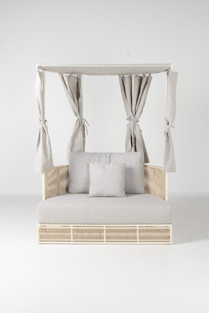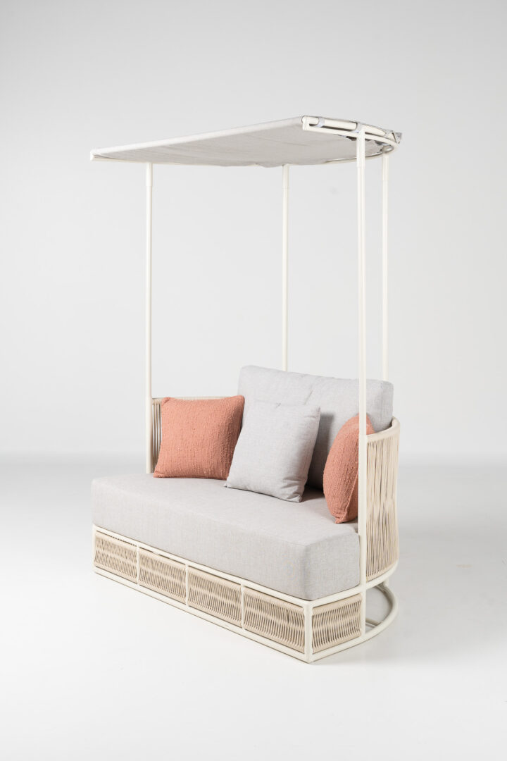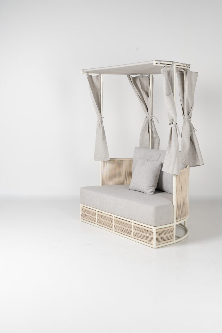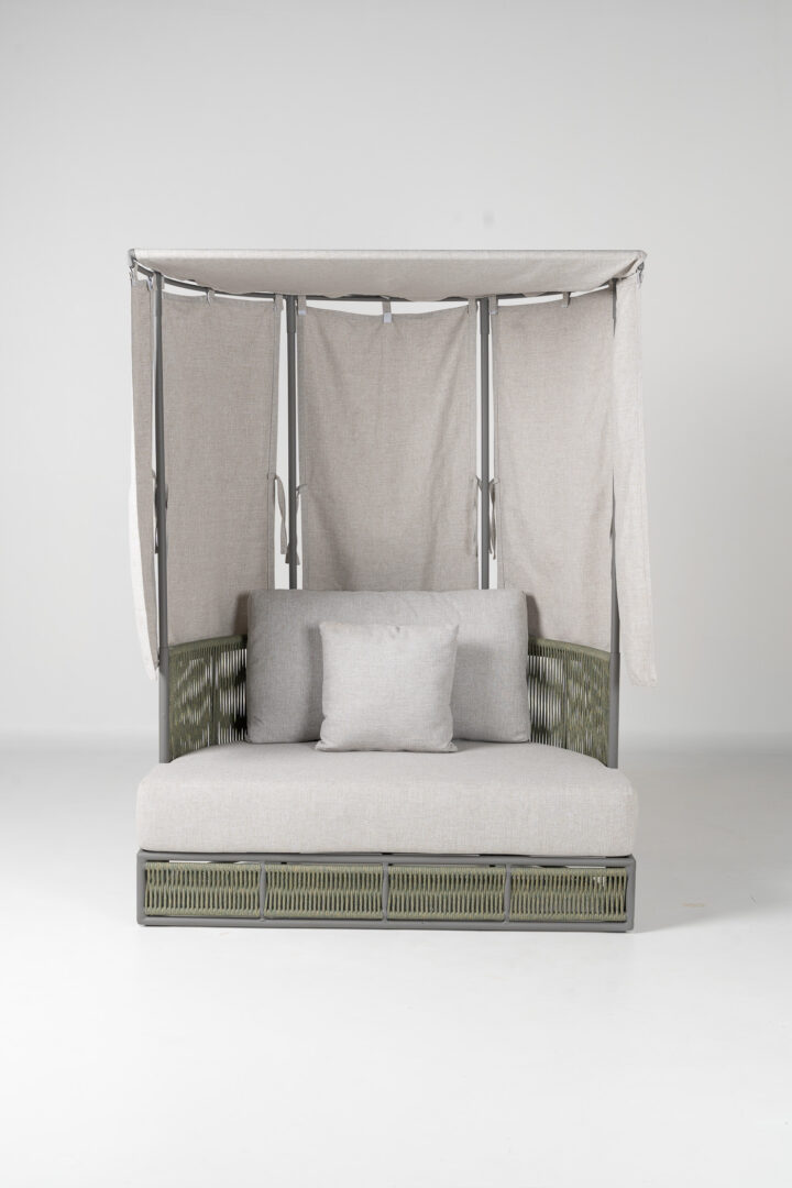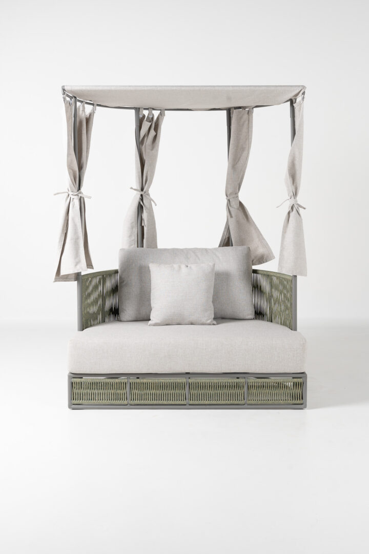 La struttura portante è realizzata in alluminio pre-verniciato, una scelta tecnica che assicura una stabilità impeccabile, estrema leggerezza e una resistenza assoluta alla corrosione e agli agenti atmosferici. Il telaio è interamente rivestito da un sofisticato intreccio manuale in corda tecnica Olefin/PP, un materiale d’avanguardia selezionato per la sua straordinaria tenuta ai raggi UV e la sua capacità di respingere l’umidità. Il punto focale del modello Ronda è il suo baldacchino integrato, un elemento funzionale che permette di modulare l’ombra e la luce, garantendo un’atmosfera intima e riparata durante le ore più calde della giornata.