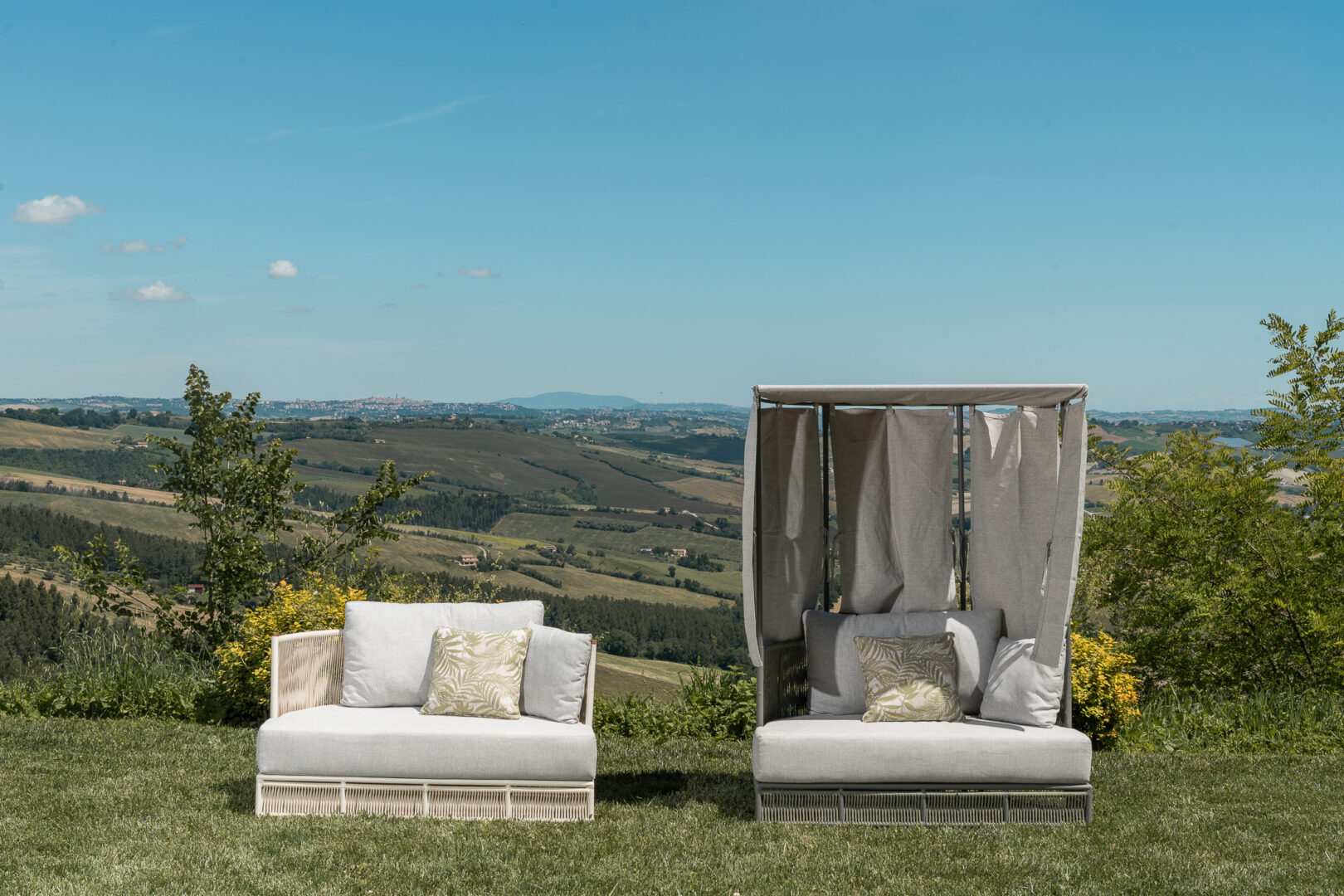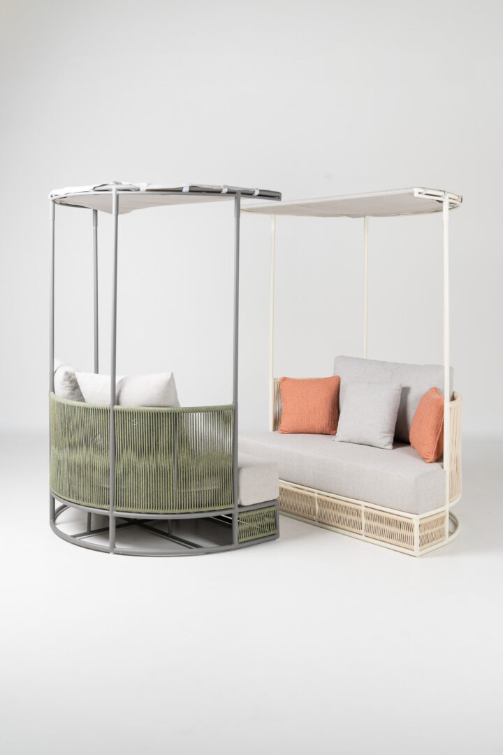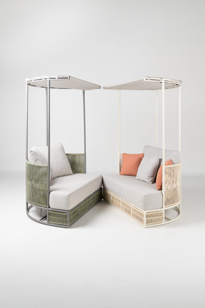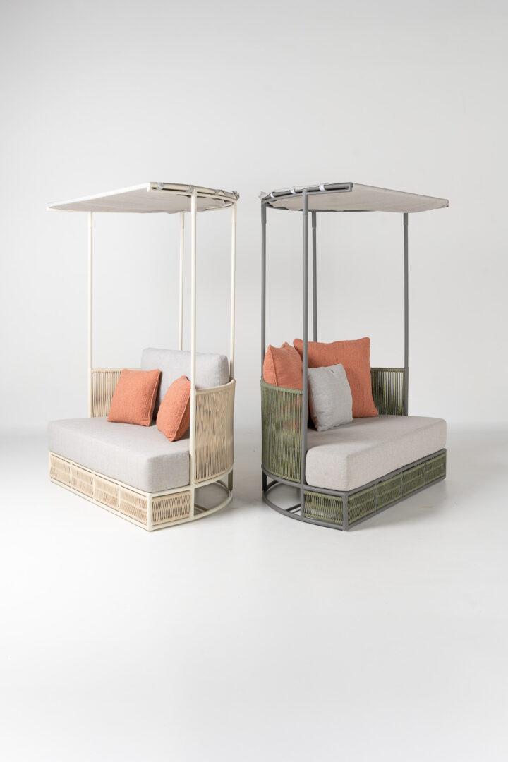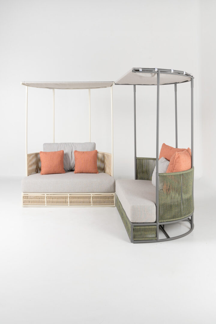 La struttura portante è realizzata in alluminio pre-verniciato, una scelta tecnica che assicura una stabilità impeccabile, estrema leggerezza e una resistenza assoluta alla corrosione e agli agenti atmosferici. Il telaio è interamente rivestito da un sofisticato intreccio manuale in corda tecnica Olefin/PP, un materiale d’avanguardia selezionato per la sua straordinaria tenuta ai raggi UV e la sua capacità di respingere l’umidità. Il punto focale del modello Ronda è il suo baldacchino integrato, un elemento funzionale che permette di modulare l’ombra e la luce, garantendo un’atmosfera intima e riparata durante le ore più calde della giornata.