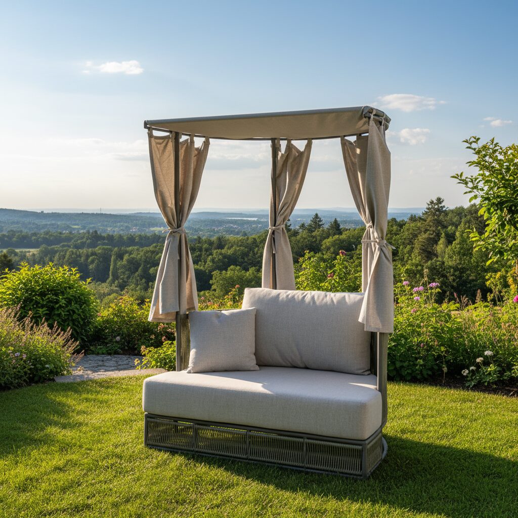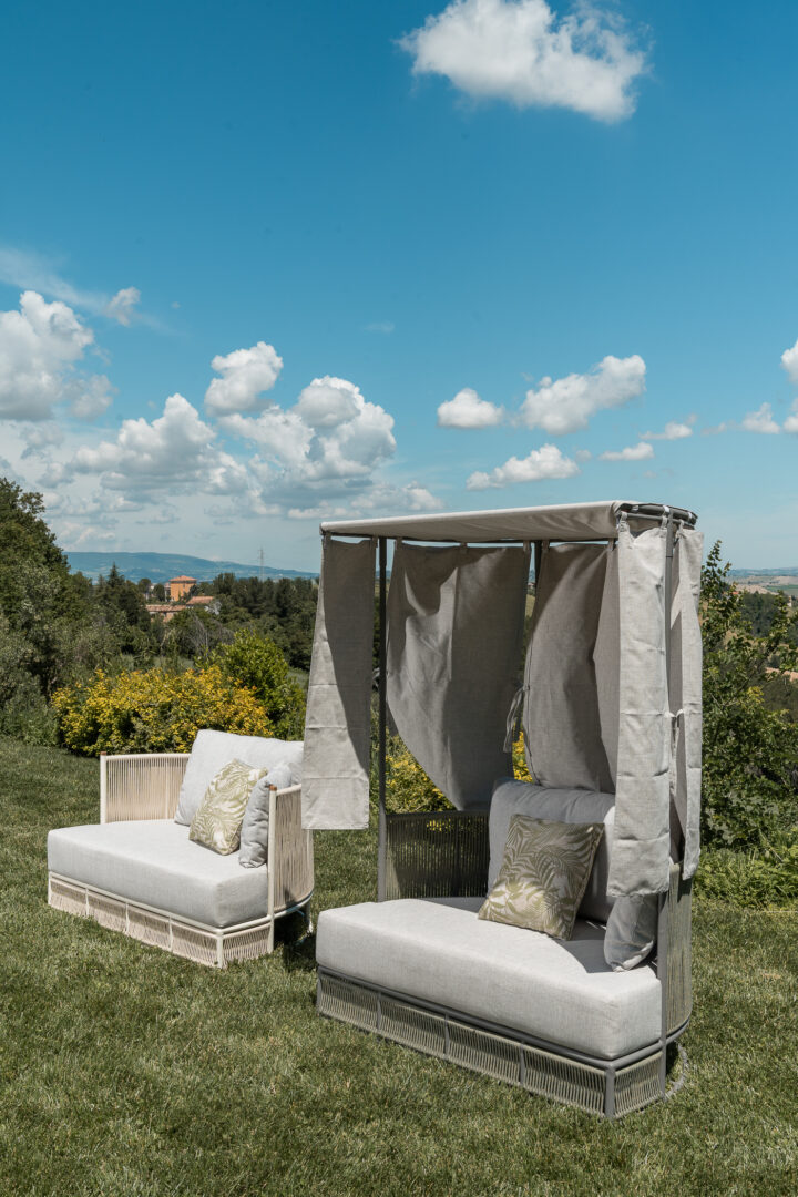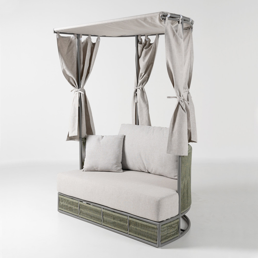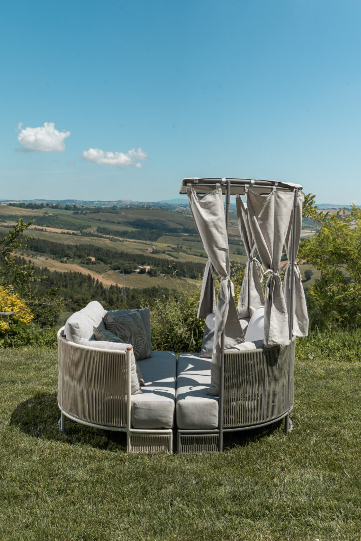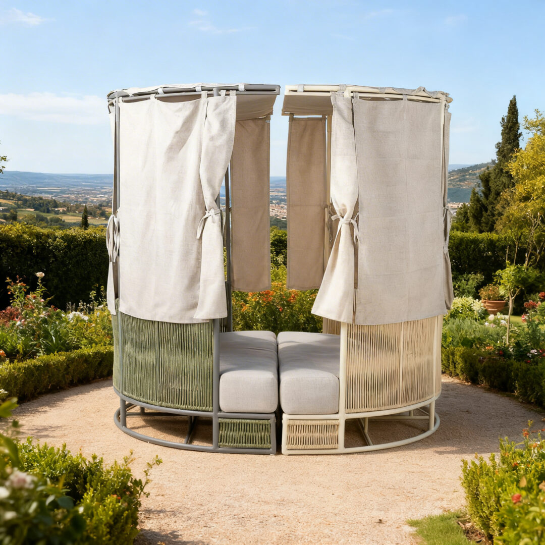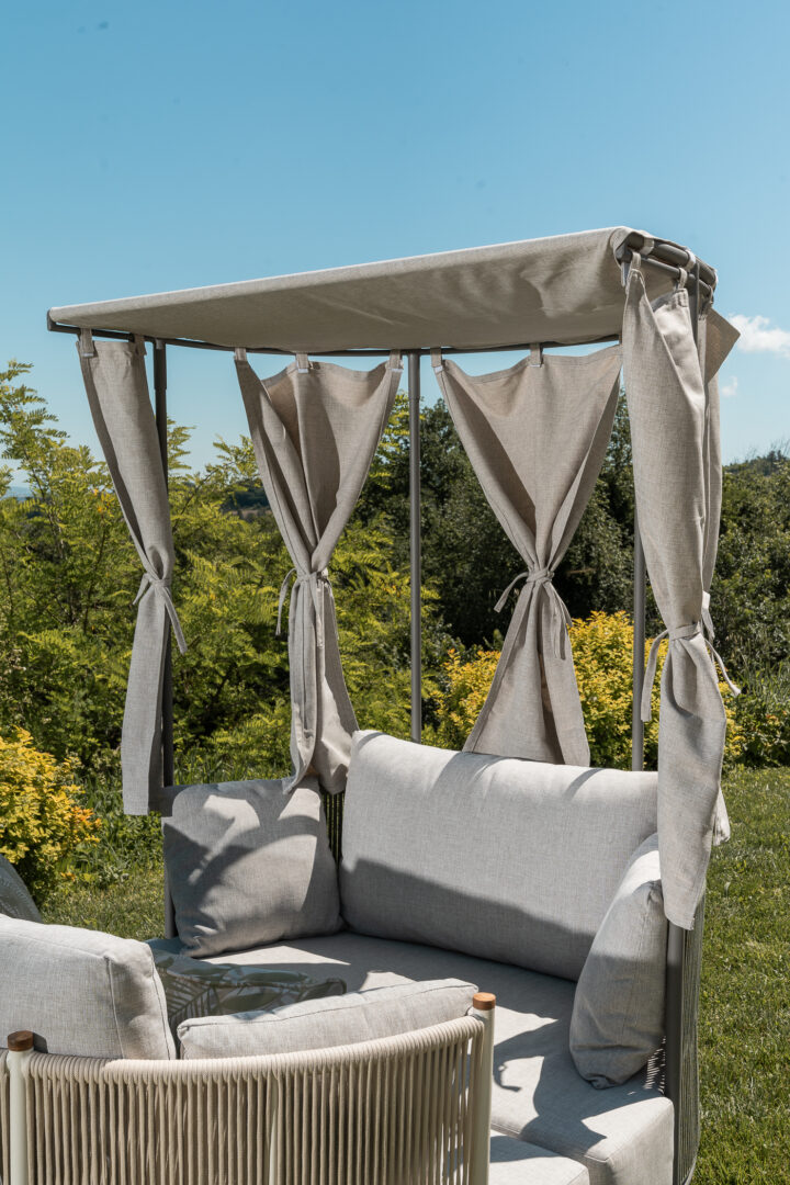Divano Mezzaluna Ronda con Baldacchino rappresenta l’apice del relax e della privacy nel design outdoor contemporaneo.