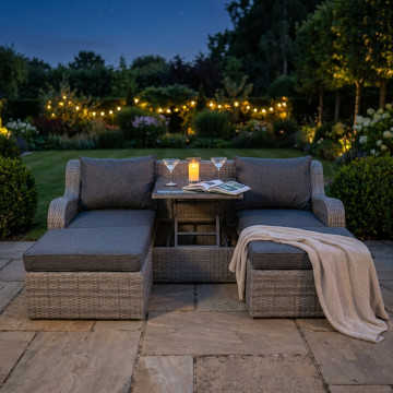 Divano Perù 2 Pouf, Struttura in alluminio, wicker GRIGIO materiale UV protection Tavolino estraibile in centro, cuscini 10 cm. Compreso di 2 Pouf.
