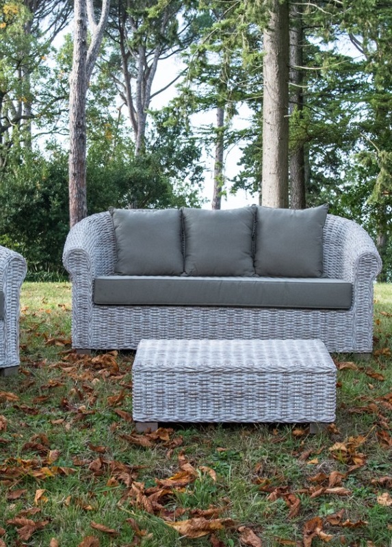 Elegantissimo per ogni  situazione d’arredo anche da esterno e interno . La fibra lavorata in rattan è naturale al 100%, è molto resistente e non inquinante, essendo biodegradabile. Ogni pezzo è unico, essendoci piccole differenze in ogni prodotto dovute all’aspetto della fibra e alla lavorazione artigianale. Completo di cuscini di qualita’ e di serie in colore grigio.