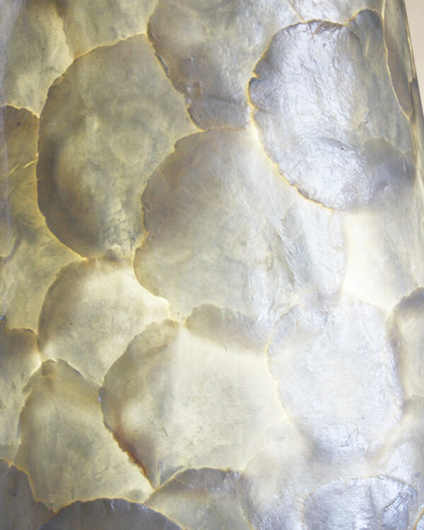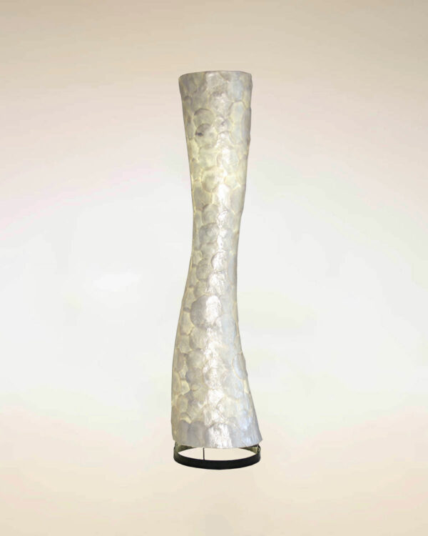 Una piantana dal design unico e suggestivo, realizzata artigianalmente con pregiate foglie di madreperla applicate su supporto rigido. La struttura sinuosa e affusolata richiama la forma di una clessidra, mentre la base rotonda in ferro garantisce stabilità e solidità. Riccamente decorata con cerchietti ornamentali, questa lampada è un perfetto equilibrio tra estetica etnica e raffinatezza contemporanea.