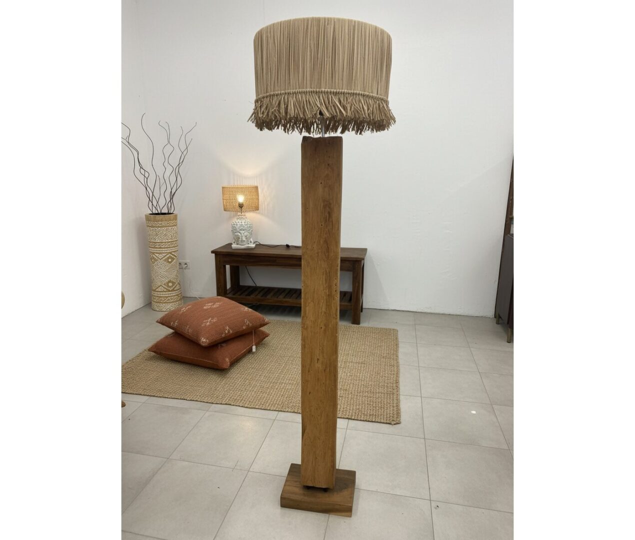A completare l’estetica naturale interviene il paralume in fibra naturale, sapientemente intrecciato per offrire una texture ricca e materica che diventa protagonista non appena la luce viene accesa. La trama della fibra scherma la sorgente luminosa in modo armonioso, diffondendo un chiarore soffuso e accogliente che proietta ombre delicate e rilassanti sulle pareti circostanti. Scegliere questo complemento d’arredo significa puntare su un’eleganza ecosostenibile e versatile, ideale per arricchire ambienti in stile boho-chic, etnico o minimalista con un tocco di calore primordiale e raffinato.
