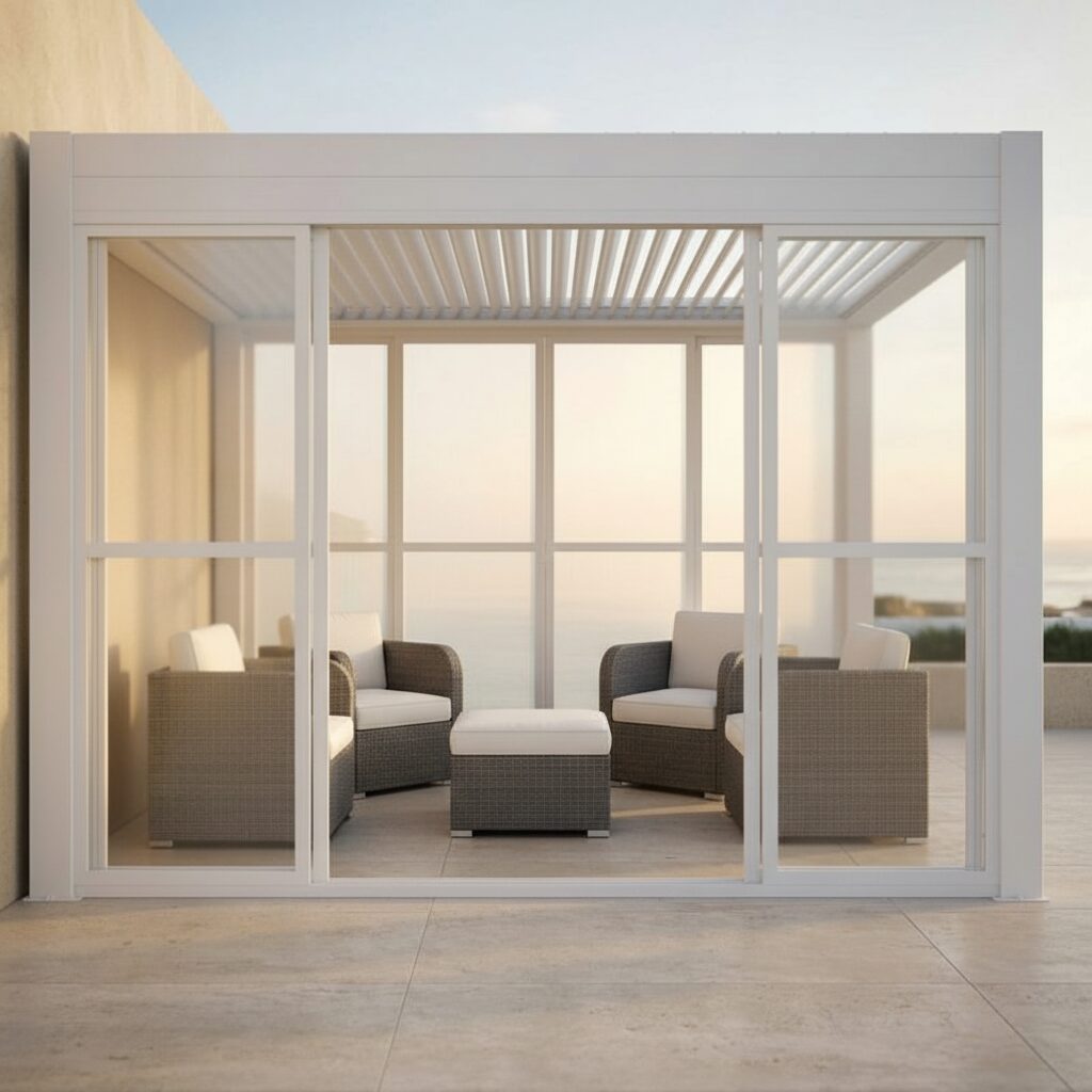 Ideale per pergole addossate o autoportanti, il laterale si integra perfettamente nella struttura esistente, offrendo una barriera efficace contro vento, pioggia e polvere, contribuendo a creare un ambiente più confortevole e fruibile tutto l’anno.