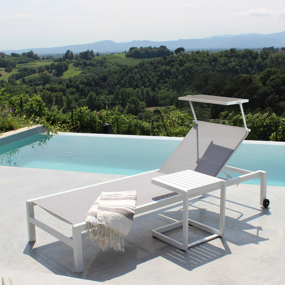 Lettino Prendisole Madison , Lettino da giardino con comode ruote, struttura in alluminio con imbottitura in textilene 2 x 1 con tettuccio.