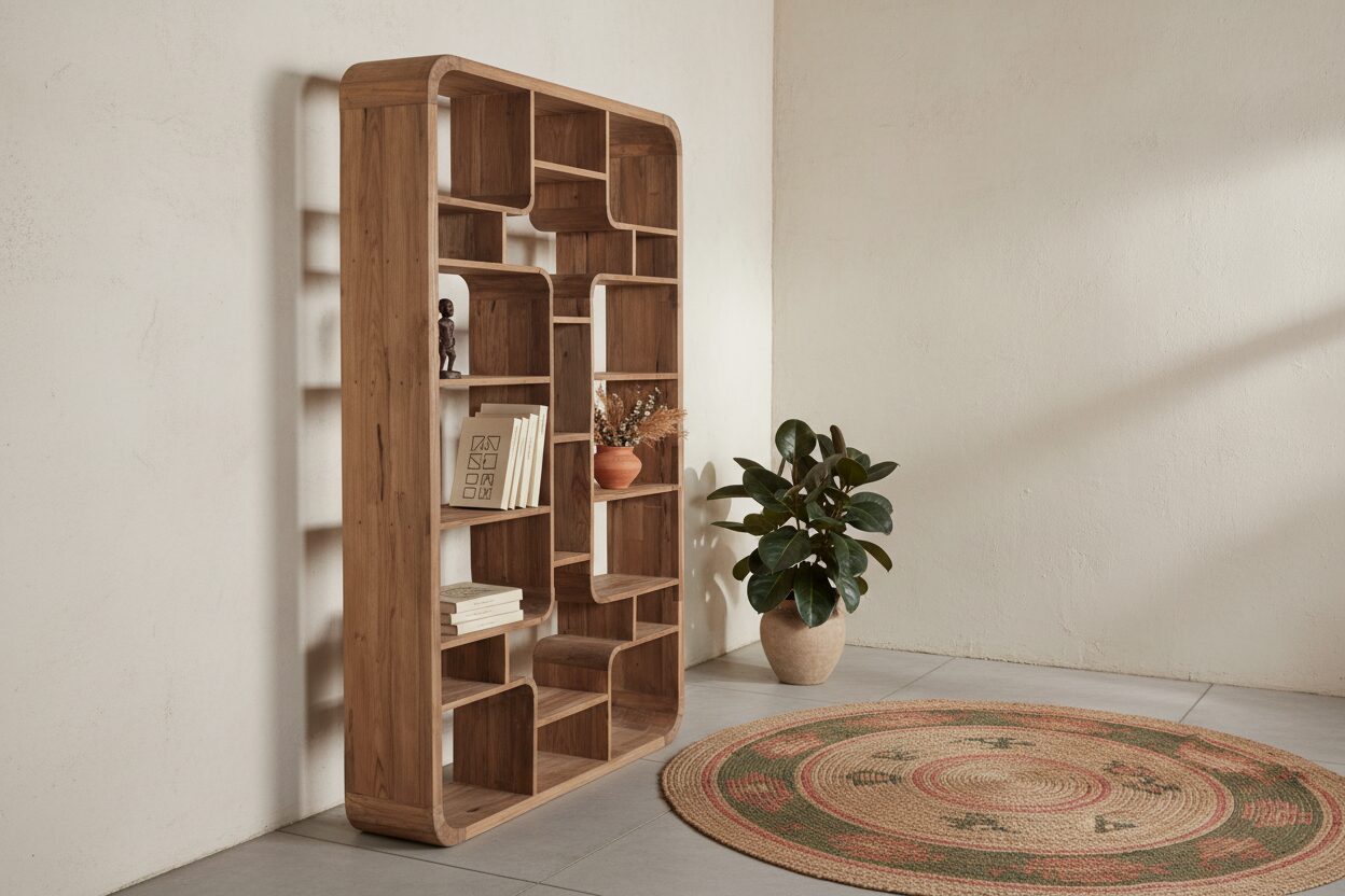 Libreria etnica in legno riciclato con vani a giorno, caratterizzata da un design artigianale e da materiali sostenibili. Robusta e decorativa, offre spazio espositivo ideale per libri e oggetti, aggiungendo un tocco caldo ed esotico all’ambiente.