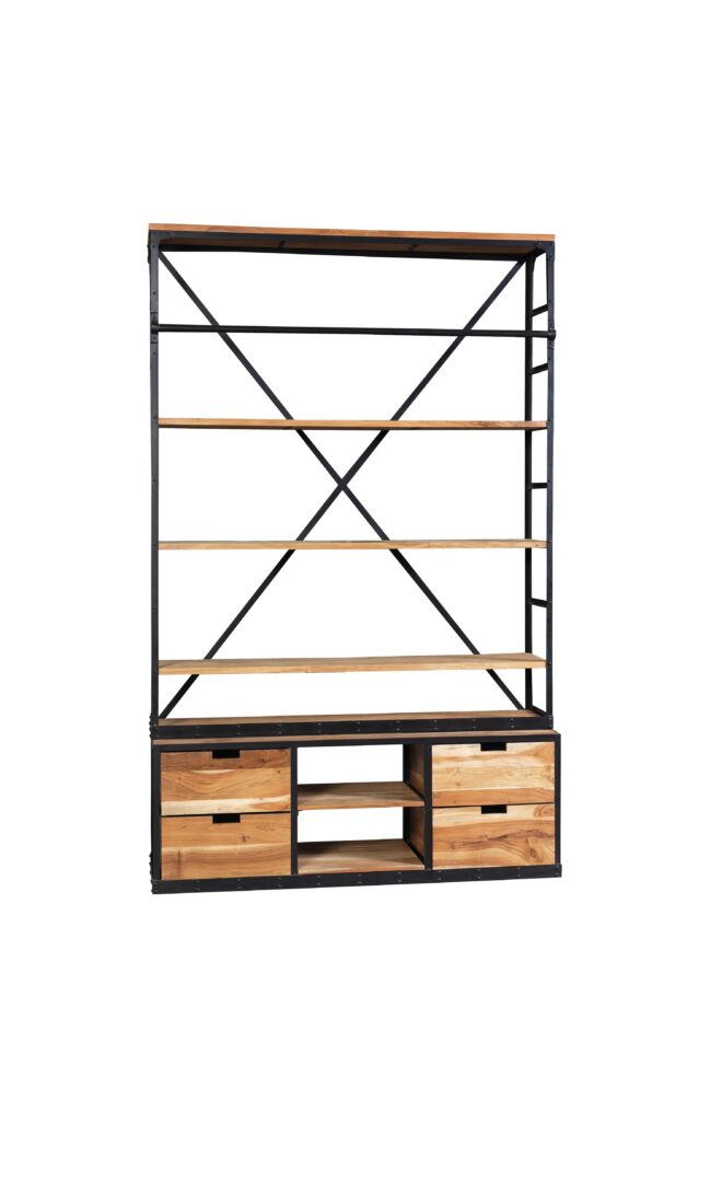 Libreria Industrial Con Scala 155 , libreria in legno massello di acacia con struttura in ferro battuto.