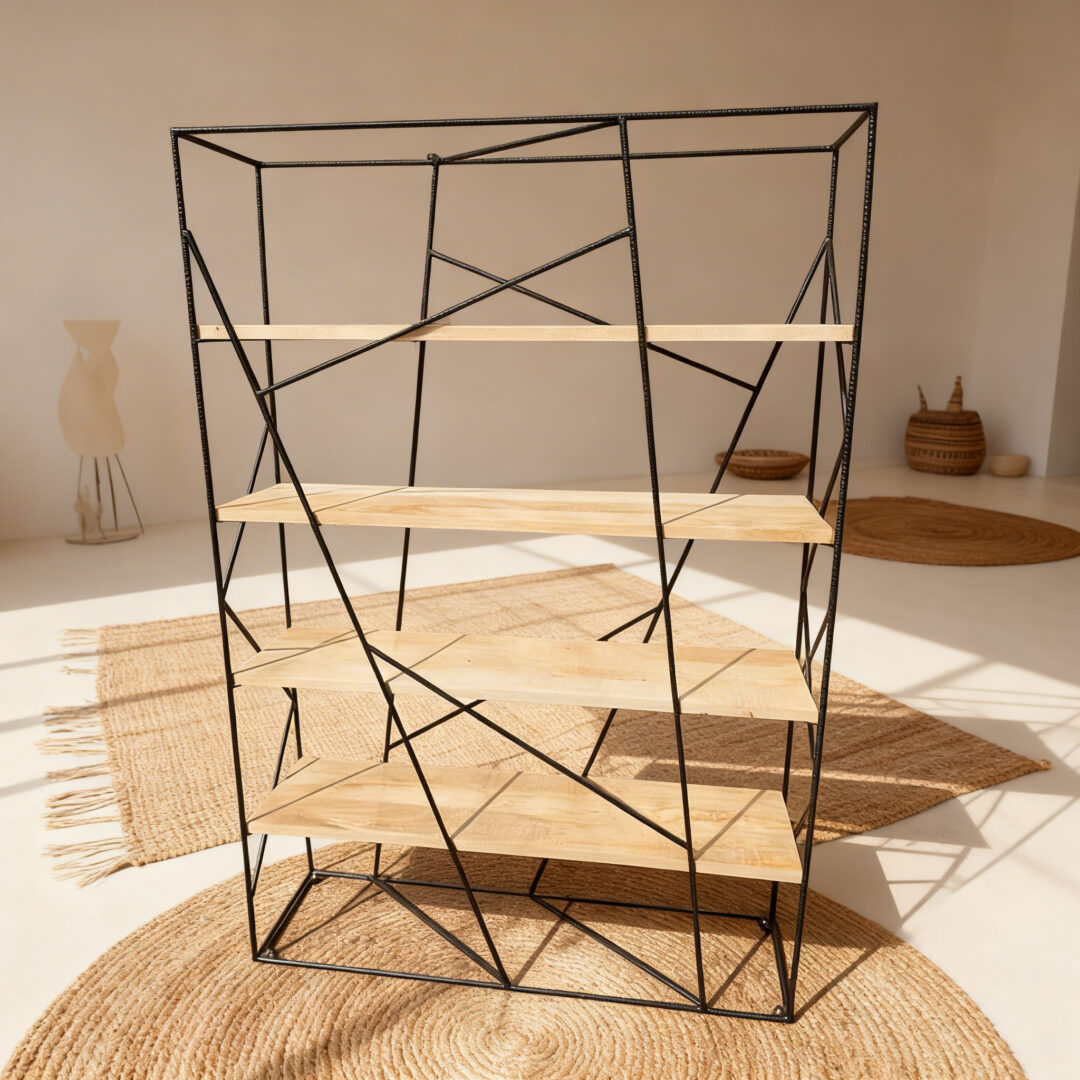 Questa libreria rappresenta la sintesi perfetta tra la forza dell’archeologia industriale e il calore esotico dell’arredamento naturale, definendo uno stile etnico-industrial di grande impatto visivo. La struttura portante è realizzata in tondino di ferro lavorato a mano, un dettaglio artigianale che conferisce al mobile una linea snella ma estremamente robusta, richiamando l’estetica delle antiche officine. Ogni curvatura del metallo testimonia la manualità impiegata nella sua creazione, offrendo un supporto solido e stabile che sfida il tempo e le mode.