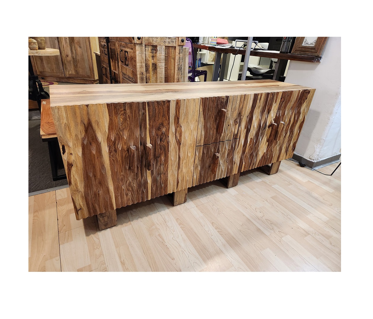Madia Credenza Cranbury, credenza in vero legno massello, lavorata artigianalmente a mano. Composta da 4 ante, con frontali lavorate e intagliate a mano. e 2 cassetti centrali con maniglia.